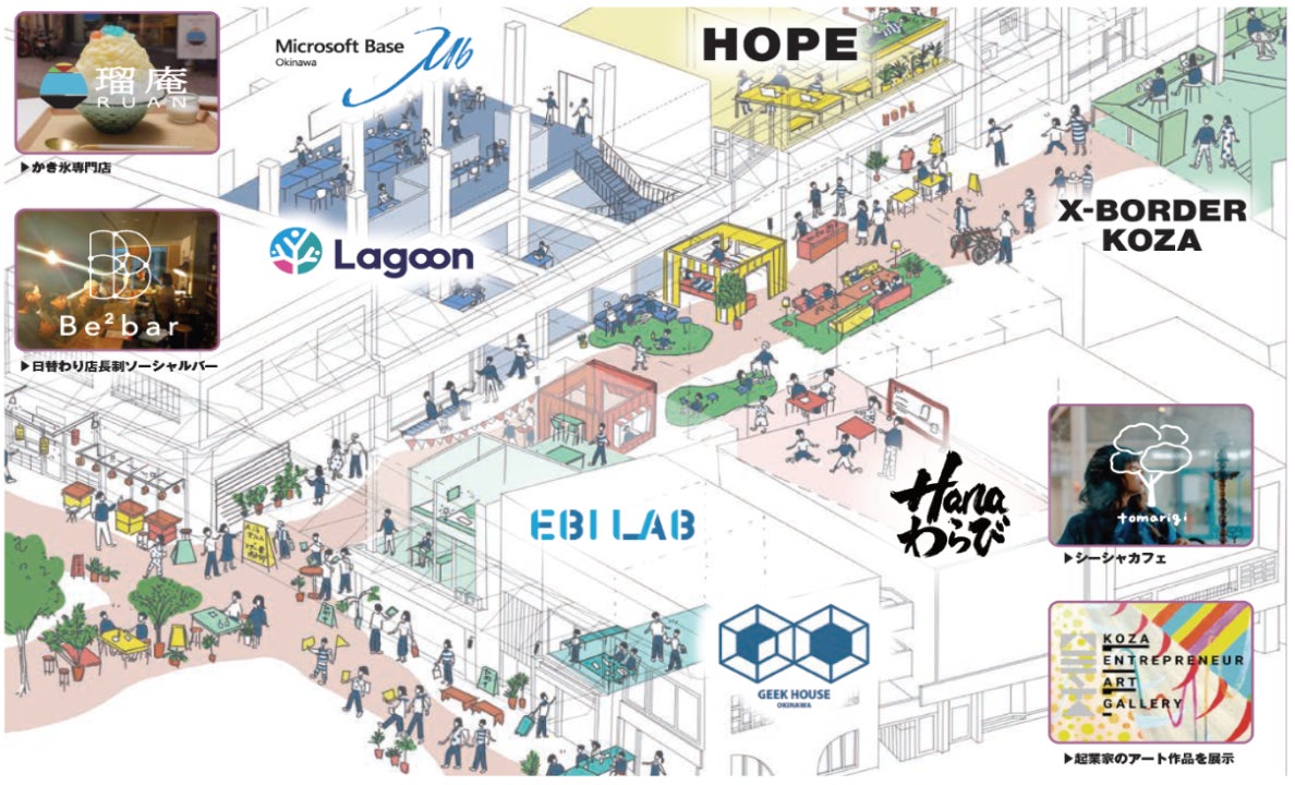 コザスタートアップ商店街はは、多様な挑戦者の拠点の集積地として、コワーキングスペースやシェアオフィス、スタートアップや県内外企業のオフィス、エンジニア向けのシェアハウス、ワーケーション向けホテル、ソーシャルバー、アートギャラリー、フリースクール等、多様な場から構成されています。「世界にイノベーションを起こす挑戦者を生み出す商店街」を目指し、沖縄発のスタートアップや挑戦者の成長の土台として人や資本を行き来させるプラットフォームとして成長を続けています。