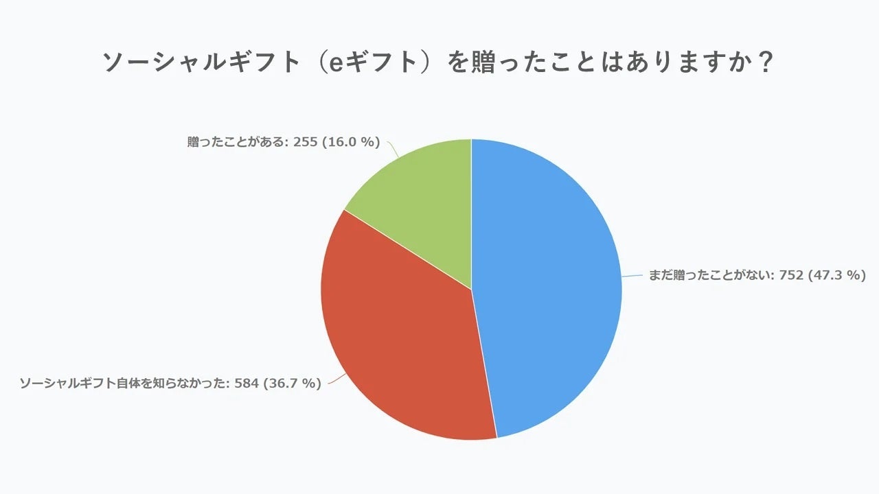 贈った事がある人が16%とまだ少ないとソーシャルギフトやeギフトを認知していない人が36.7%もいる事から、まだまだ成長途中の市場である事が伺える内容となりました。