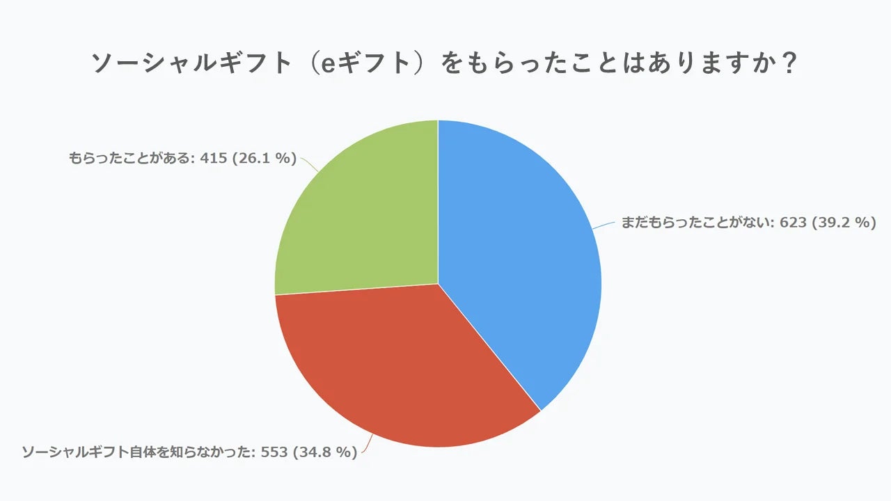 「もらった事がある」の回答者26.1%という数字は前述の「もらった事がある」の回答16%から比べると10%増えた形となり、利用者の多くは1人あたり平均2人に対してソーシャルギフト(eギフト)を贈った経験があるという事が分かりました。
