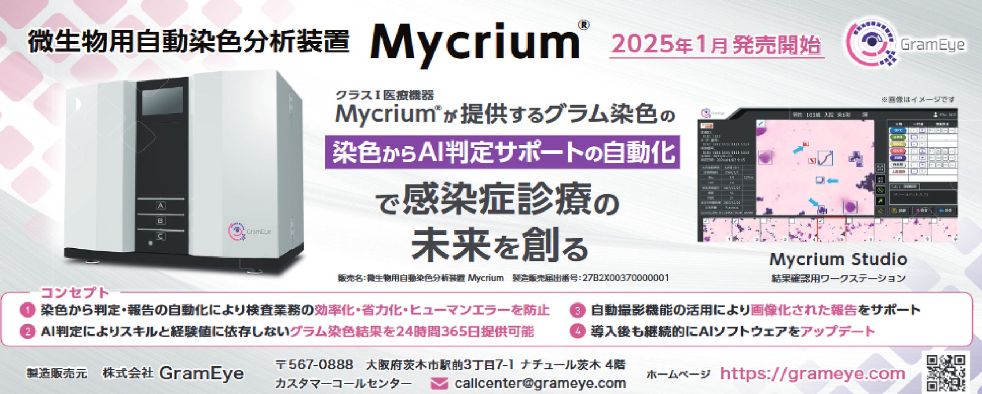 GramEyeは、感染症診断領域において、微生物検査の初手である「グラム染色」の自動化を実現するMycrium®を2025年1月に上市しました。