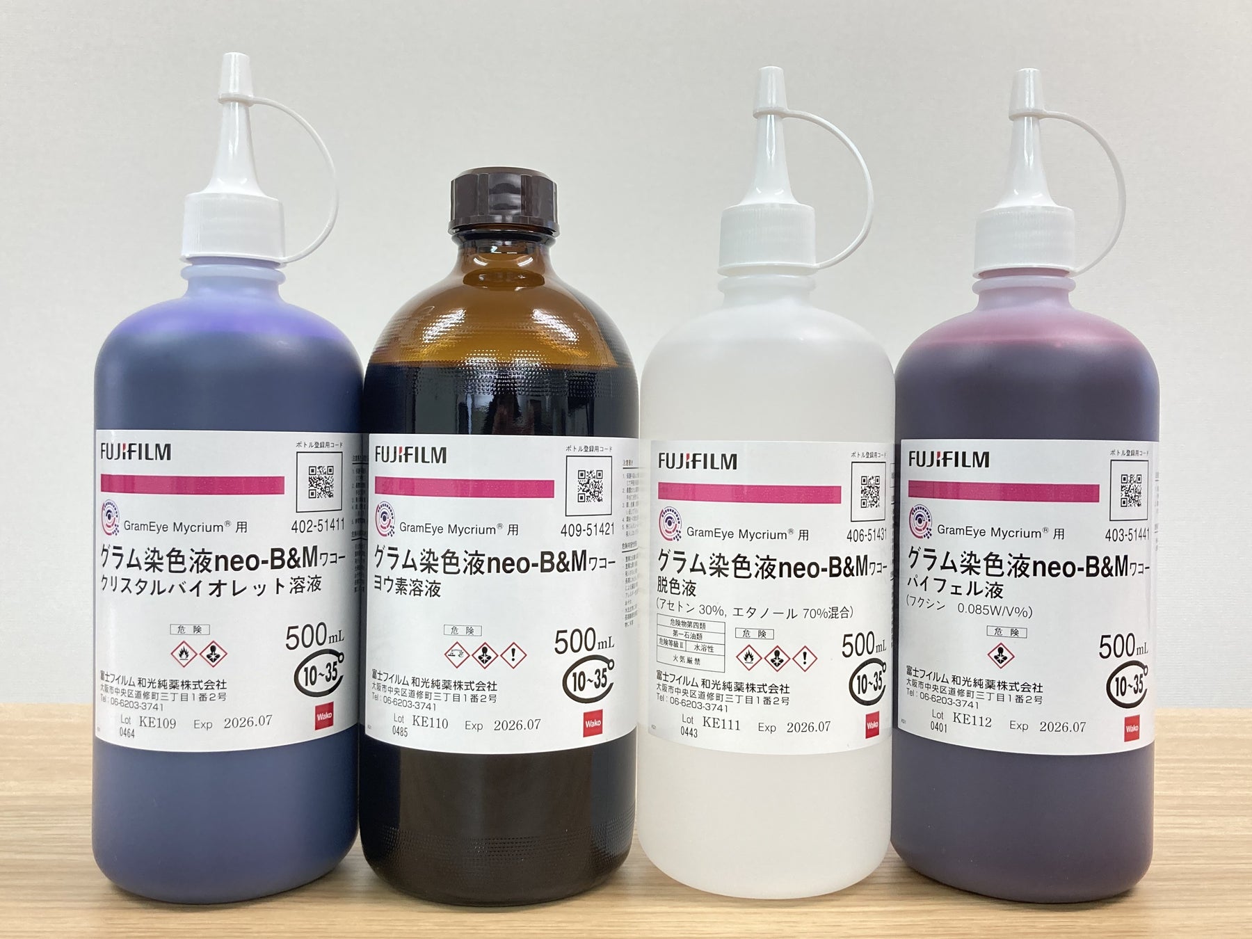 GramEyeは、染色液試薬および販売体制に強みを持つ富士フイルム和光純薬が製造する専用試薬を用いたグラム染色を提供し、Mycrium®の精度向上および運用の最適化を図ります。