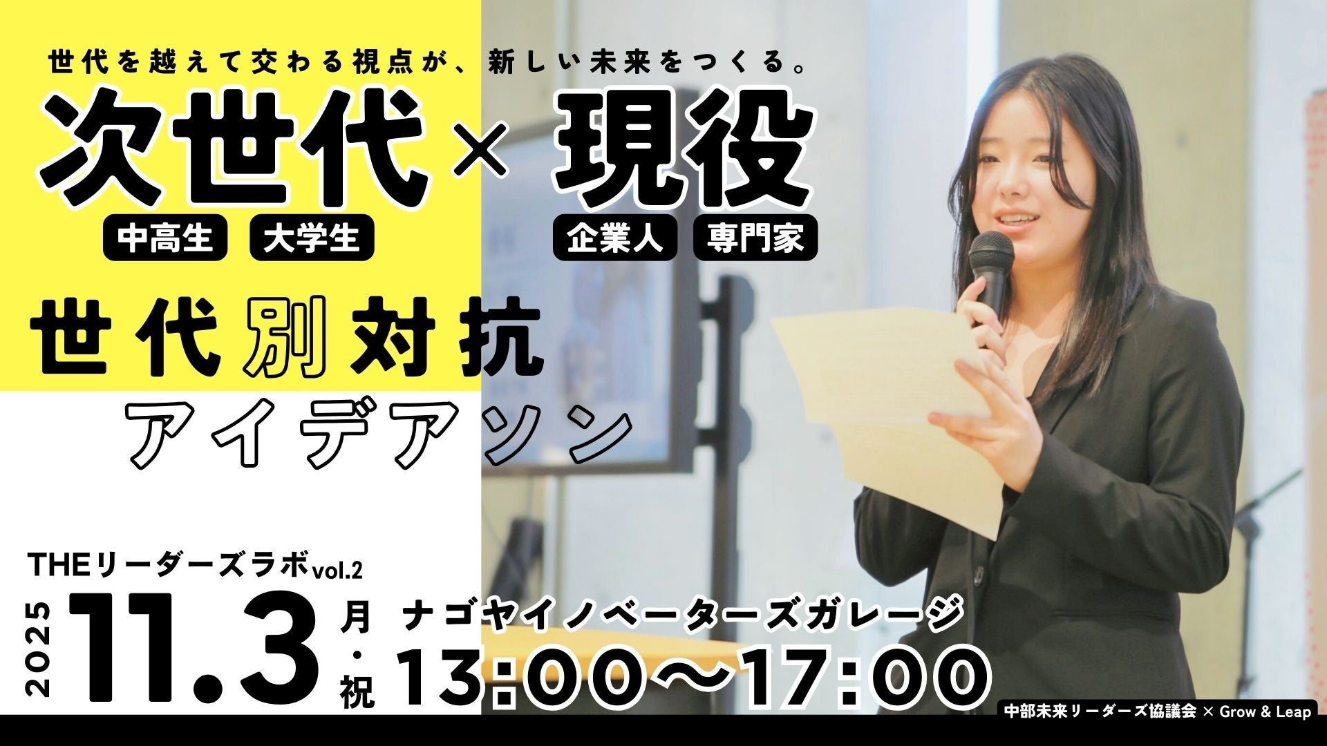 NPO法人Grow & Leap(所在地:愛知県名古屋市、代表理事:倉田佳代子)は、11月3日(月・祝)、名古屋市中区のNAGOYA INNOVATOR’S GARAGEにて、世代を超えた新感覚のアイデアソン「THEリーダーズラボ vol.2」を開催します。