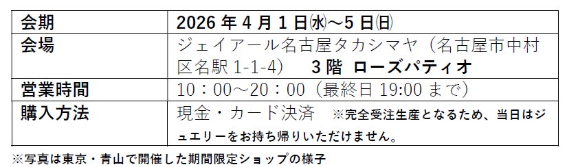 宝石商 櫻井彩子(所在地:東京都文京区)は、2026 年4 月1日(水)~5 日(日)の5 日間、ジェイアール名古屋タカシマヤ(名古屋市中村区)にて、ジュエリーの“コンサルティング接客”を百貨店会場で体験できる期間限定ショップを開催いたします。
