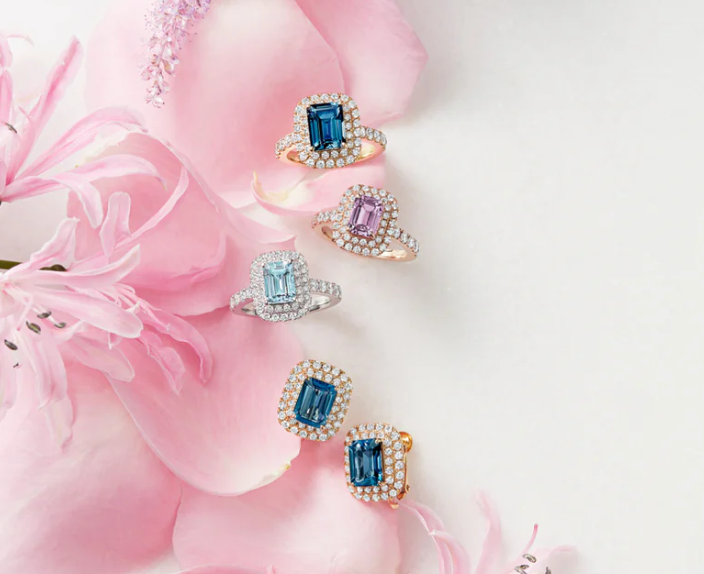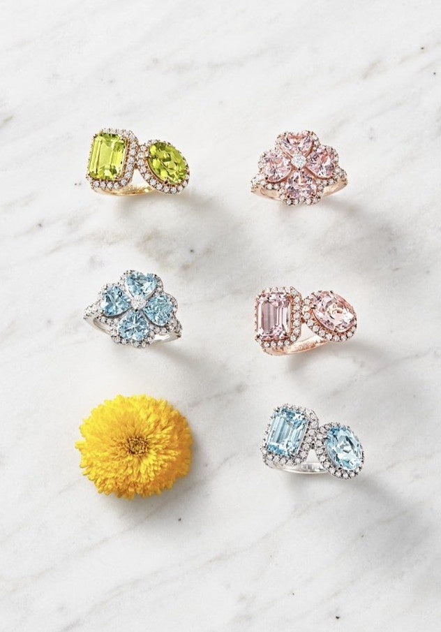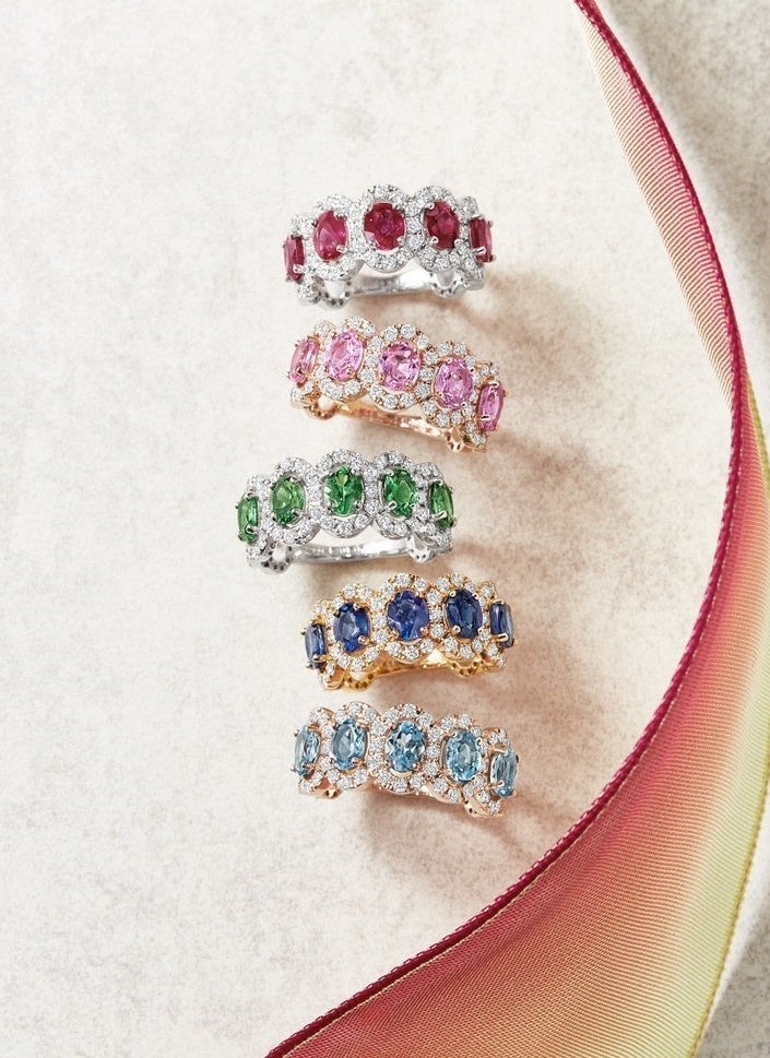 40 万円以下で人気の色石も選抜投入。手の届きやすい購入導線をご用意。貴石と呼ばれるエメラルドやルビーなども展示。今回初登場の“春の新作”はルビー・パパラチアを使用しています。