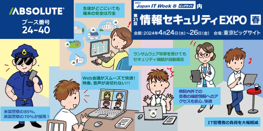 レジリエント(回復力、抵抗力 ※1)・ゼロトラスト・セキュリティ・ソリューションのプロバイダであるAbsolute Software 株式会社 (以下、Absolute) は2024年4月24日 (水)~ 4月26日 (金)に東京ビッグサイトで開催される日本最大級の IT 展示会『Japan IT Week 春』の一部として開催される『情報セキュリティ EXPO【春】』に出展いたします。