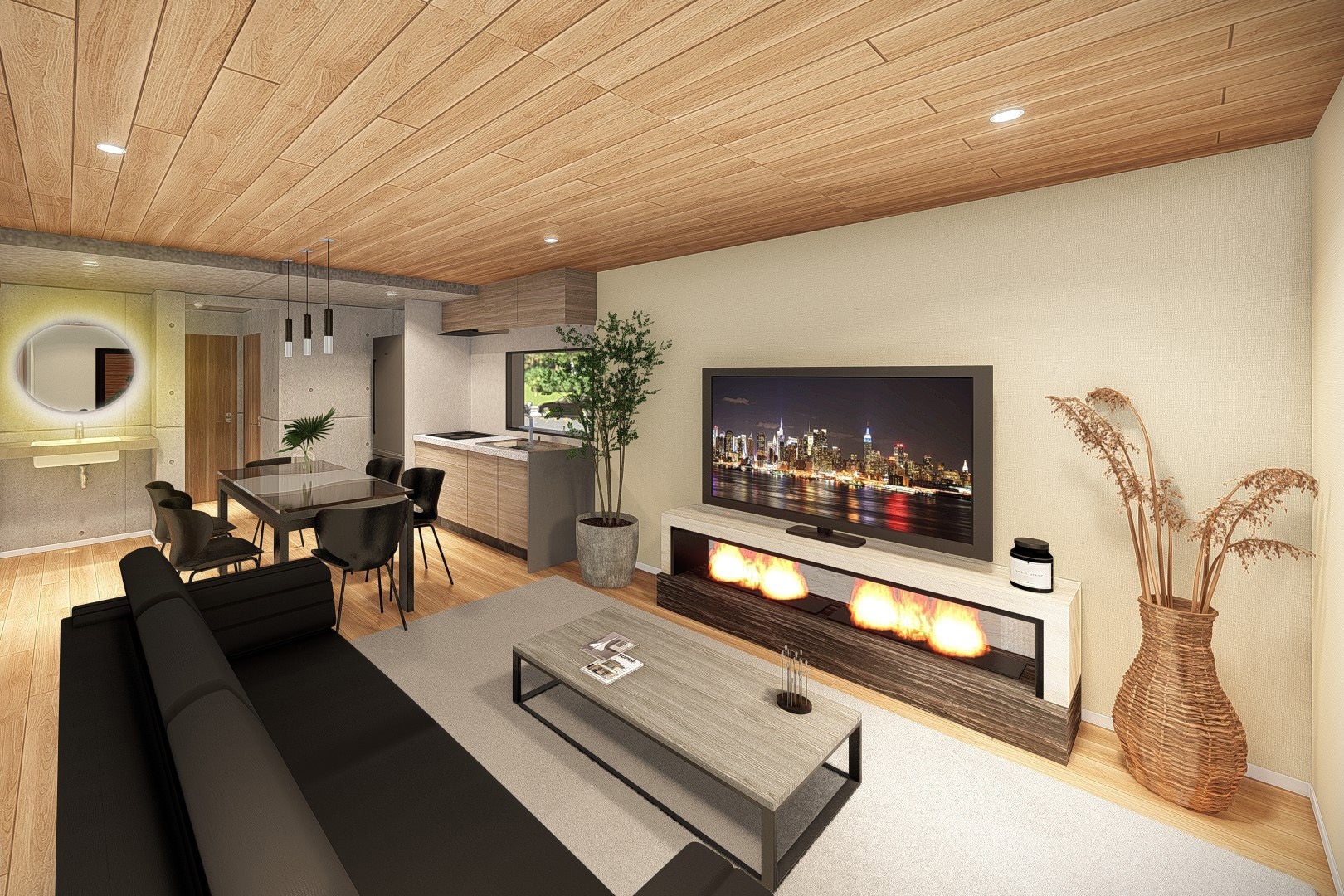 広々としたダイニングやリビングスペースを確保。大型テレビと電子暖炉で癒しの空間を演出しています。また、キッチンや冷蔵庫、調理器具も充実しており、近くのお店で海鮮や特産品を購入して料理を楽しんだりしていただくことができます。