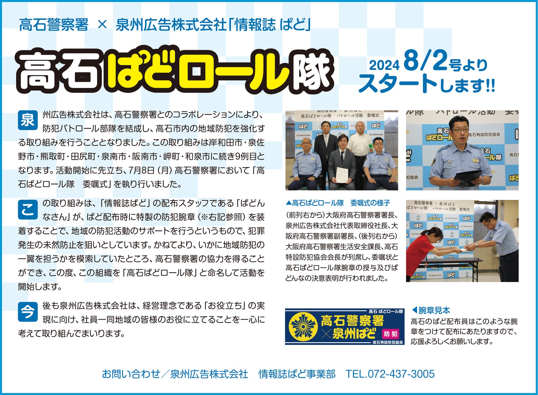 関西ぱどと同グループで、「ぱど泉州版」を発行している泉州広告株式会社と、高石特設防犯協会とのコラボレーションにより、高石市で防犯パトロール部隊を結成し、地域防犯を強化する取り組みを行う事になりました。2024年8月2日(金)よりスタートいたします。