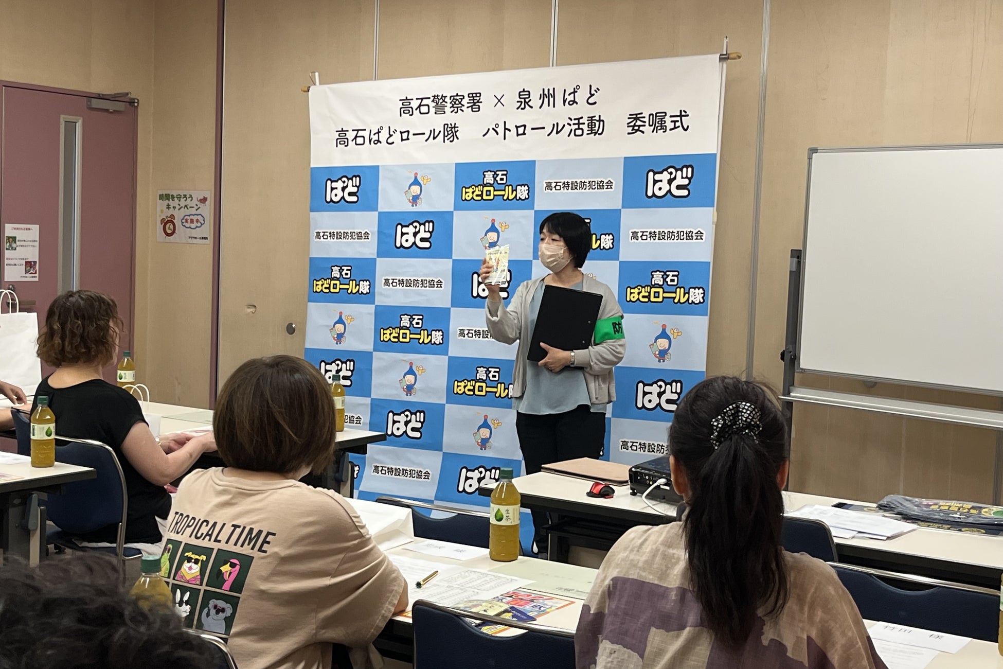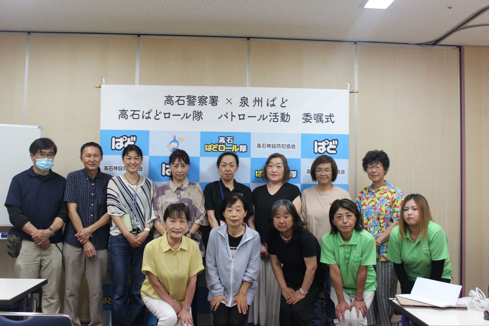 この取り組みは、岸和田市・泉佐野市・熊取町・田尻町・泉南市・阪南市・岬町・和泉市に続き9例目となります。8月からの活動開始に先立ち、7月8日(月)に、高石警察署にて「高石ぱどロール隊」の委嘱式を行いました。