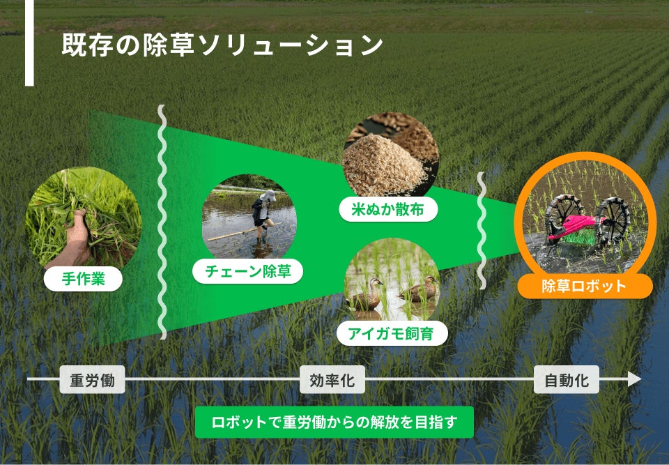 最初は「自分たちが草取りをやりたくない」という思いから、たまたま発明家の友人がいたので水を濁らせて草を防ぐロボットを作ろうという話になり、大学の同級生にも加わってもらい「ミズニゴール」を開発しました。それが農業の大きな課題解決につながることが分かり、会社を立ち上げるきっかけになりました。