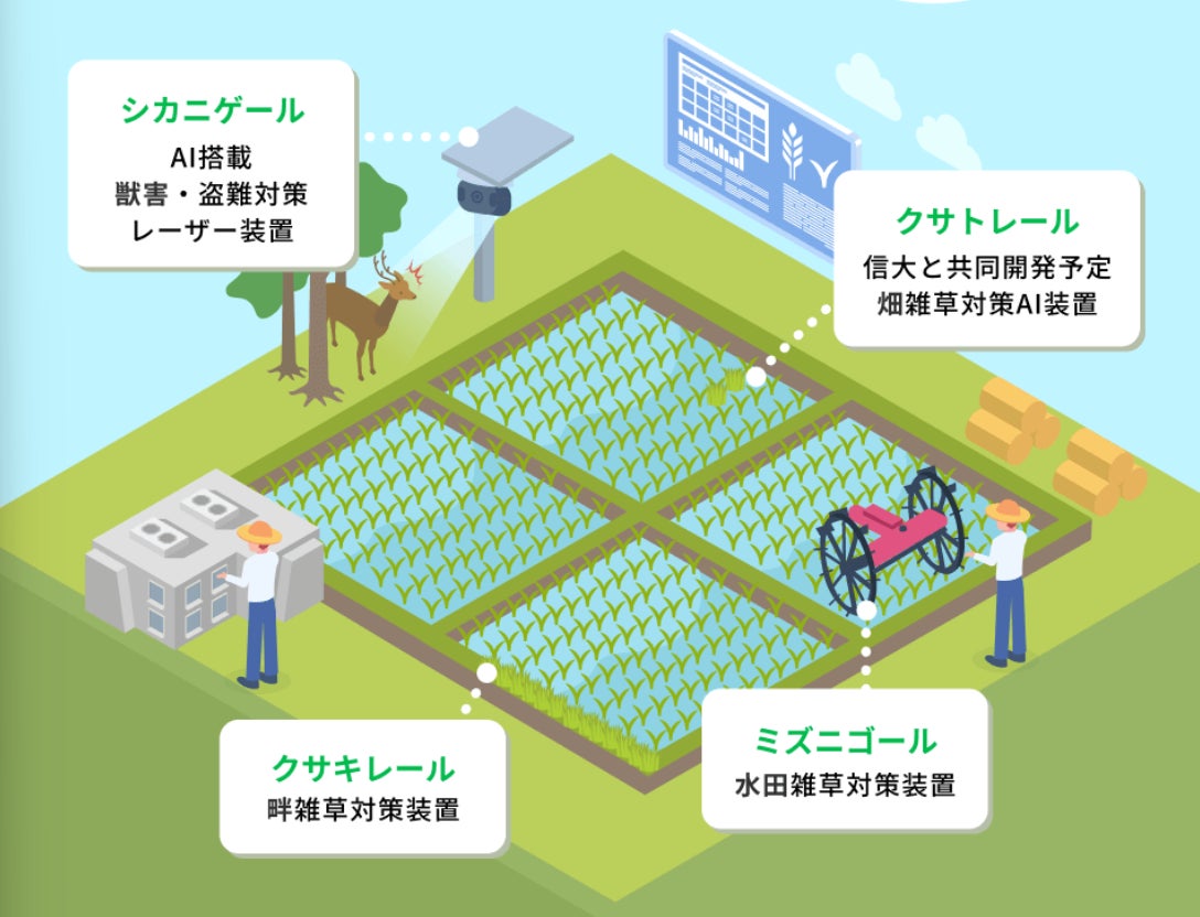 「シカニゲール」や田畑の雑草を刈り取る「クサキレール」「クサトレール」などの自動化製品を開発していく計画です。また、将来的には田植えから除草、収穫まで、さまざまな水田作業を1台で自動化する中・大規模農家向けロボット「タンボホットケール」を開発予定。全国の農家の方々の重労働からの解放を実現することで、味・安全性の追求や食品加工、販路拡大、ブランディングに取り組める環境を作るなど、テクノロジーを通じて農業をより楽しくクリエイティブな産業にしてまいります。