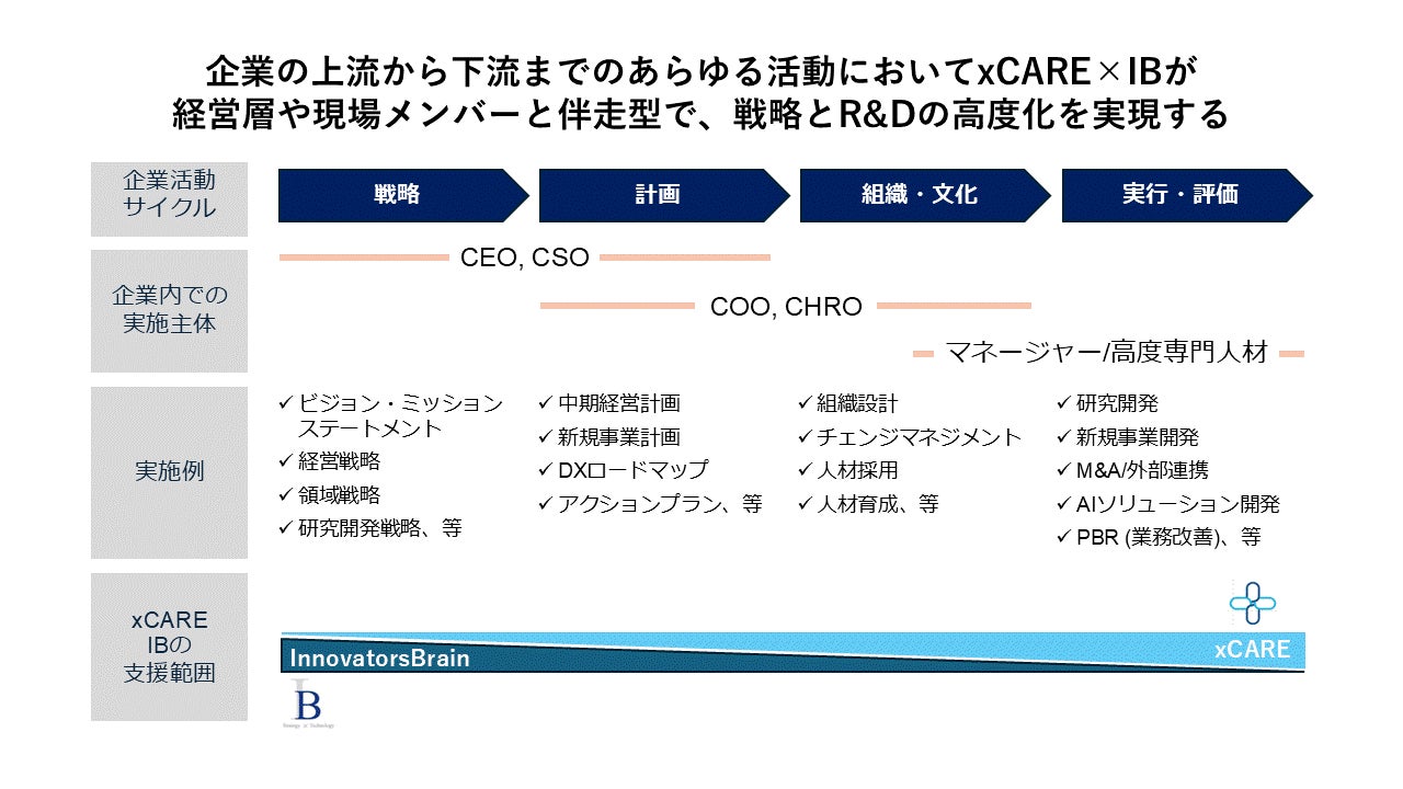 専門家集団である私たちxCAREとイノベーターズ・ブレインが、パートナーとして「戦略」、「経営」、「組織・人材」、「R&D」、及び「DX」などのライフサイエンス企業における多様な企業活動を支援することで、顧客企業が自社単独では難しい ”2つの両利きの経営” を実現します。
