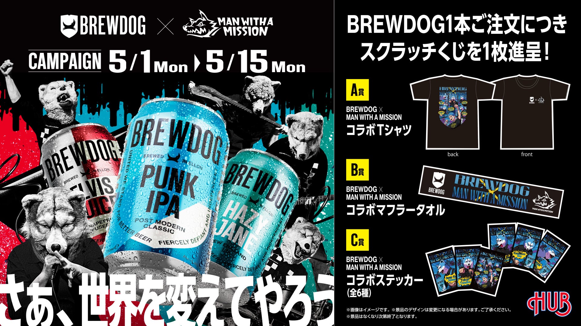 英国の国内に数万件あるとされるパブの文化を日本に広める使命のもと、日本国内で英国風パブを展開するHUBにて、5月1日(月)~15日(月)の期間限定で、BREWDOGの展開する内の三銘柄(PUNK IPA、ELVIS JUICE、HAZY JANE)が展開される。 “文化をつくっていく”という両者のミッションが共感しあい、この度の提供と相成った中で、先日よりBREWDOGが共にミッション達成に向けて歩んでいるMAN WITH A MISSIONとのキャンペーンも実施、限定アイテムが提供されることになった。この機会により気軽にBREWDOGを楽しむだけではなく、ファン必見のアイテムもゲットしてみてくれ。