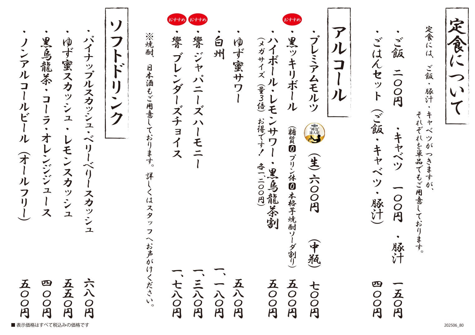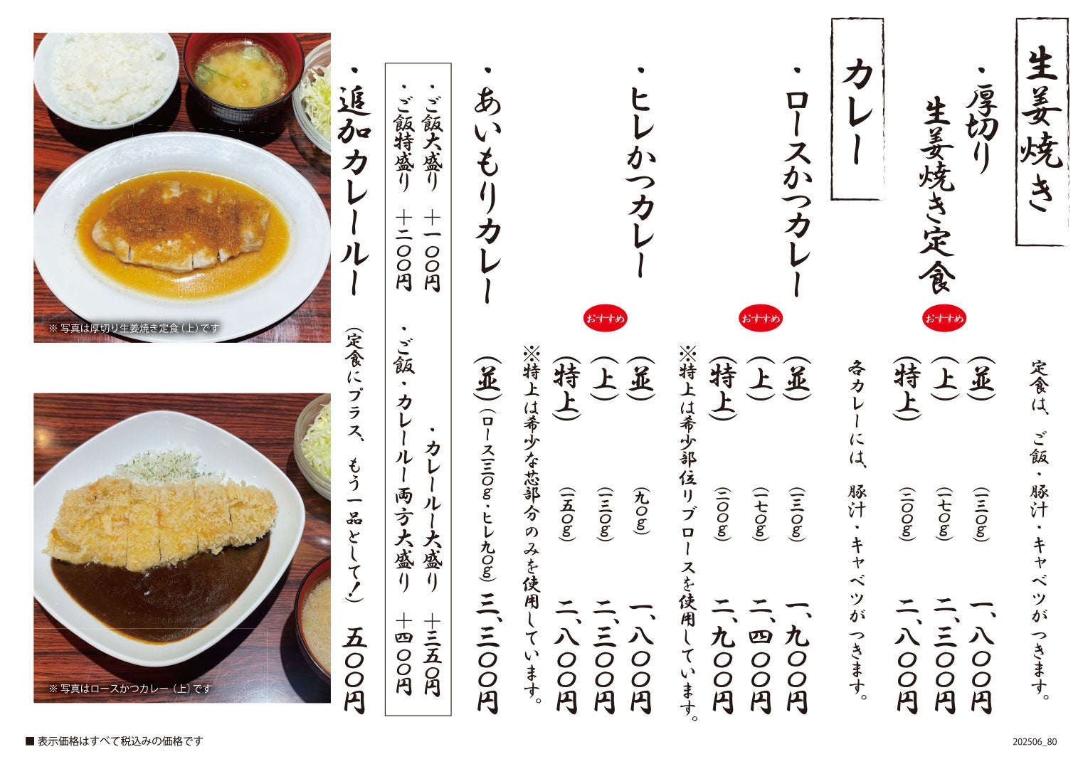 ※上記他、とんかつの豚肉を使用した生姜焼き、メンチカツ、おつまみメニュー、ソフトドリンク、