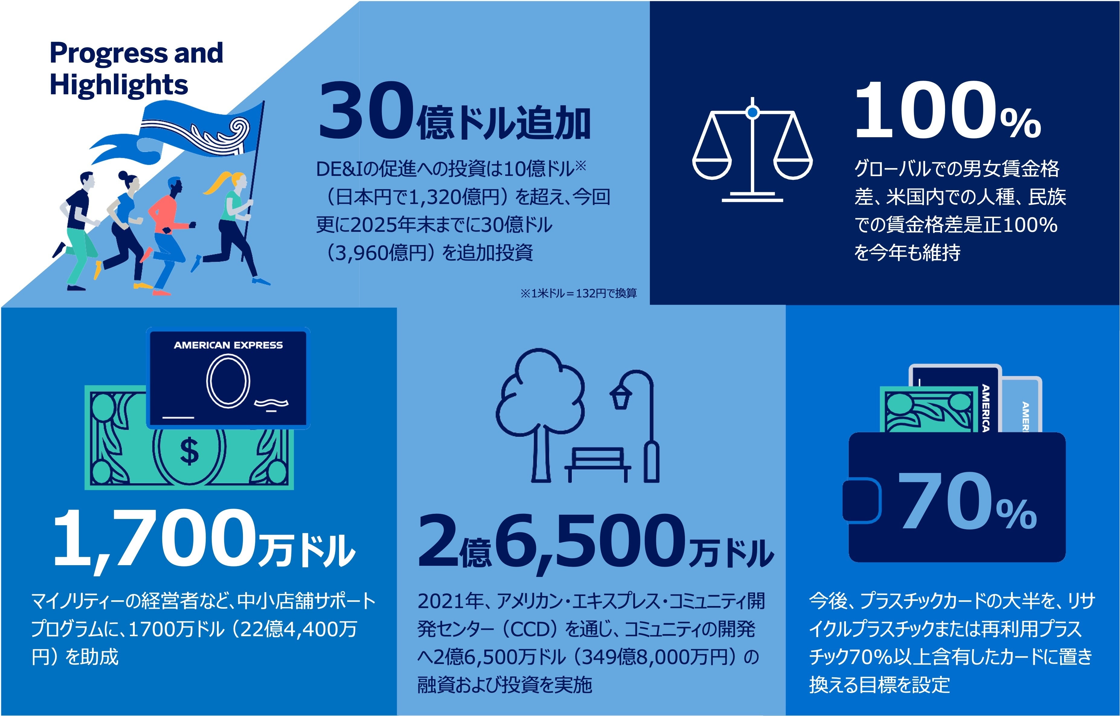 - アメリカン・エキスプレスは、DE&I行動計画促進に10億ドル(1,320億円)以上を支出しましたが、2025年末までに更に30億ドル(3,960億円)を追加投資し、総額40億ドル(5,280億円)の投資を発表しました。