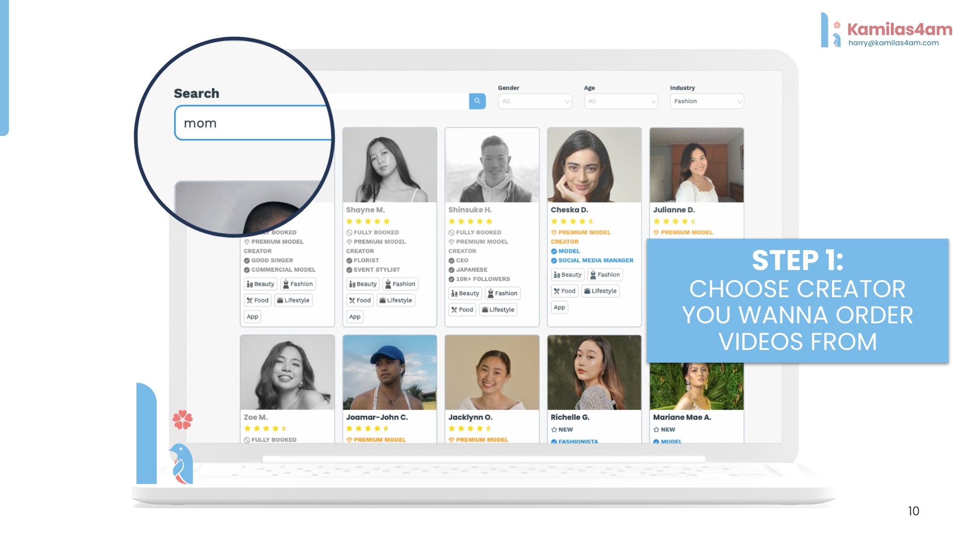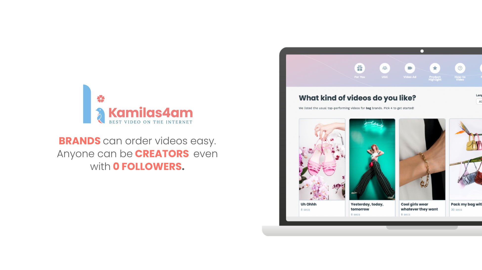 Kamilas4amは、フォロワー0でもコンテンツクリエイターになることができ、クリエイターのコンテンツをブランドが今すぐフードデリバリーのようにオーダーできるプラットフォームを提供しています。