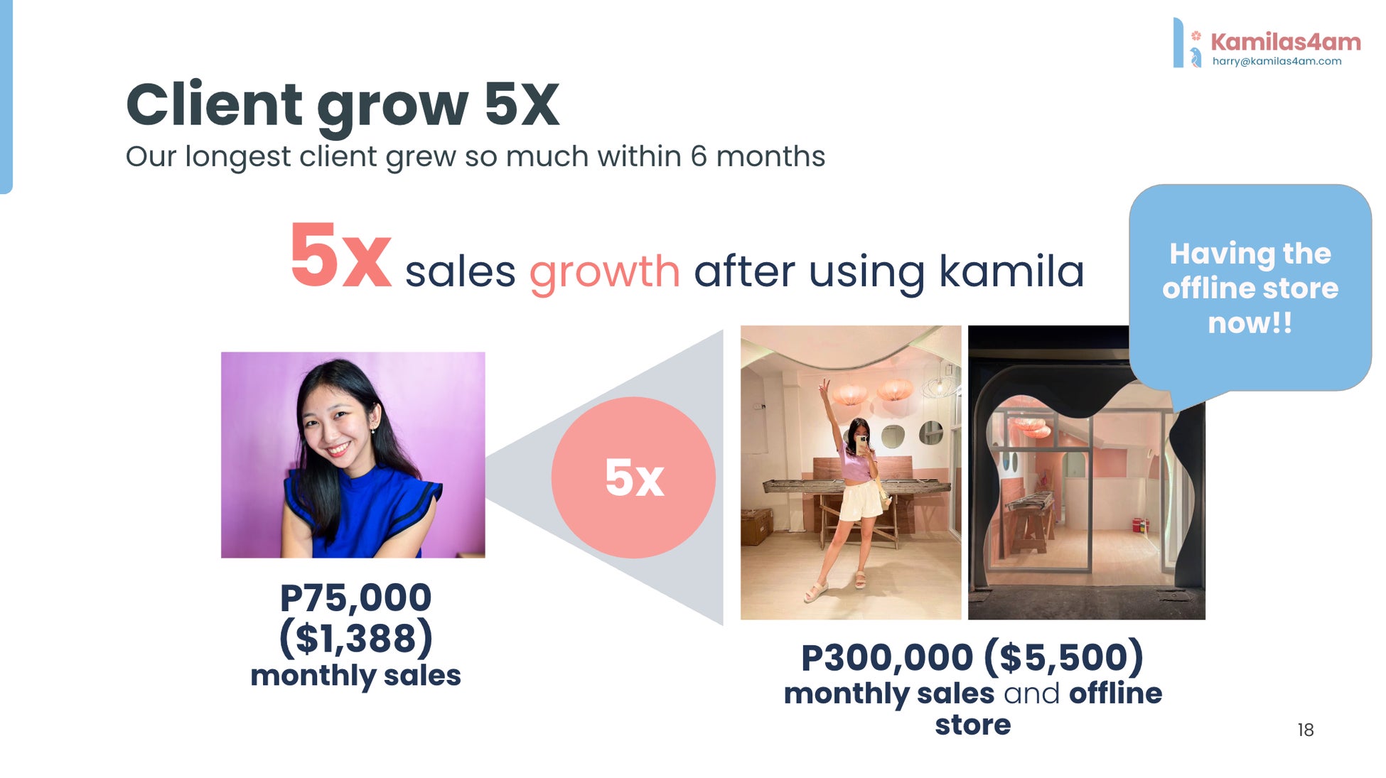 2022年11月のサービス開始以来、Kamilas4amは順調に成長を続けており、サービス開始当初に想定していたフィリピン国内のスモールブランドに限らず、カナダ、イギリス、シンガポール、タイといった国々のブランドからオーダーを受けており、2,000以上の動画制作を行いました。