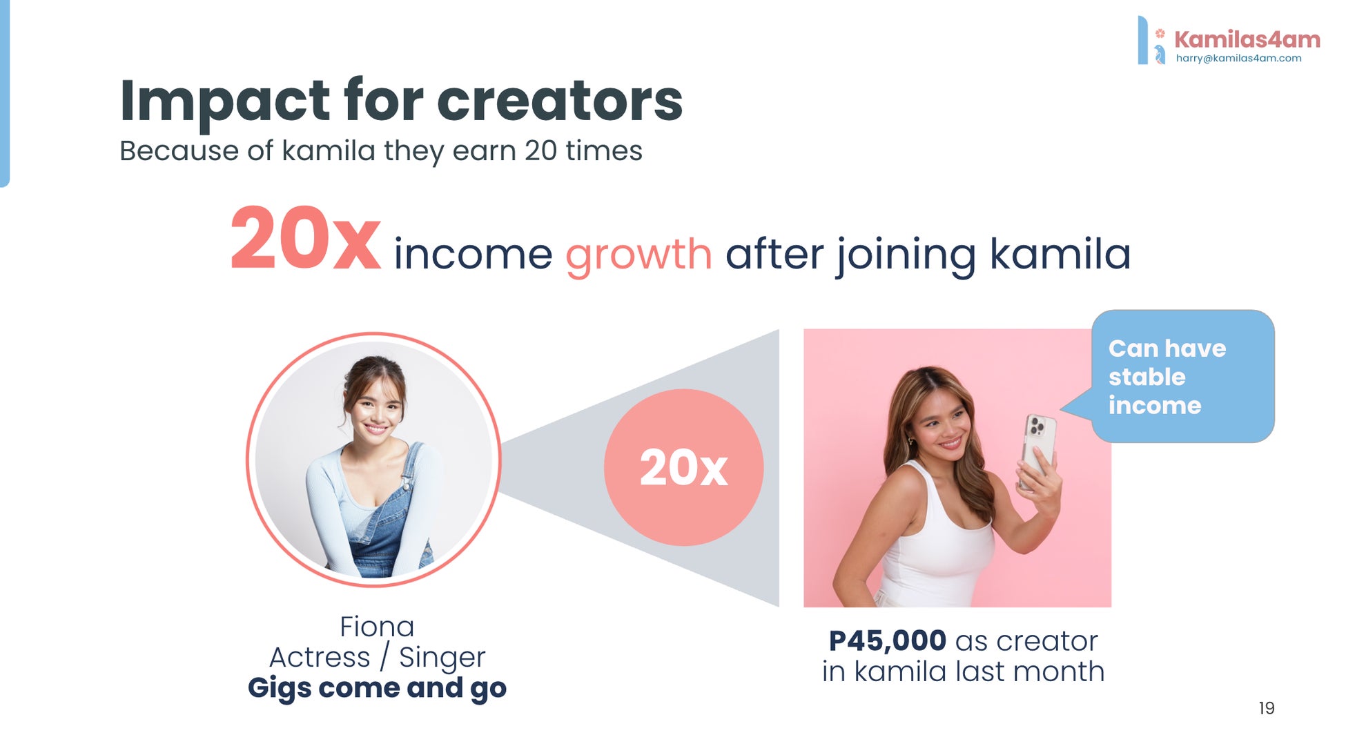 クリエイターの方にも大きなインパクトがありとあるクリエイターはクリエイターとしての収益が20倍伸びた事例もあります。なぜこのようなことが起きるかというと、Kamilas4amのUGCクリエイターは元はクリエイターとして稼ぐことが非常に難しかった人たちであり、我々のプラトフォームを通して稼ぐことができるようになっています。