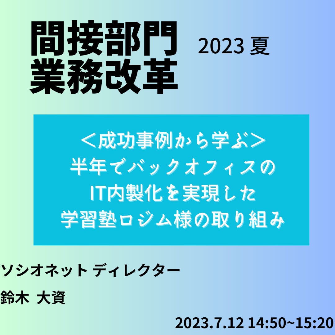 7/12(水)14:50~、ソシオネット株式会社 ディレクター 鈴木大資の「間接部門業務改革 2023 夏」(オンライン開催)への登壇が決定。
