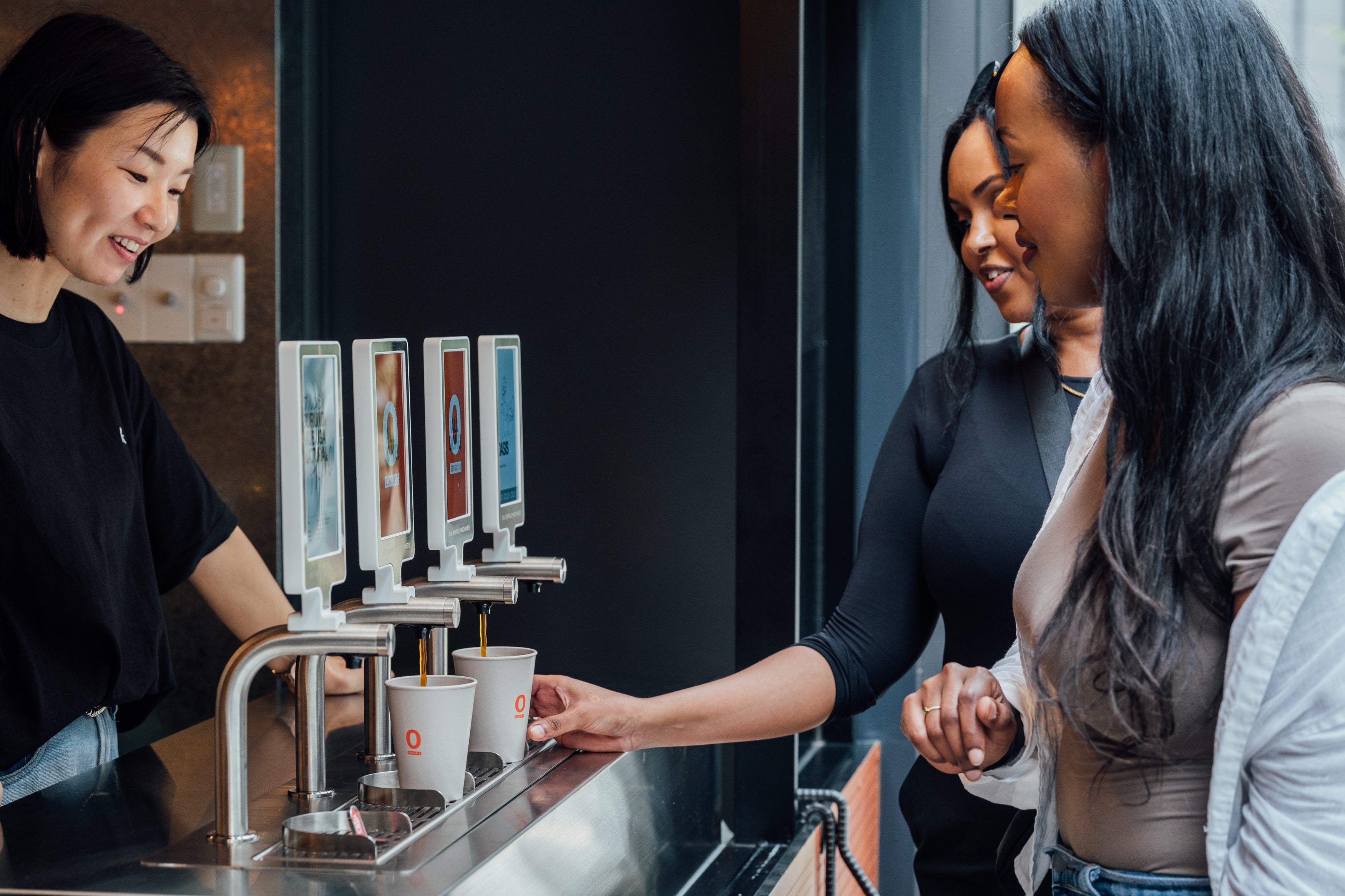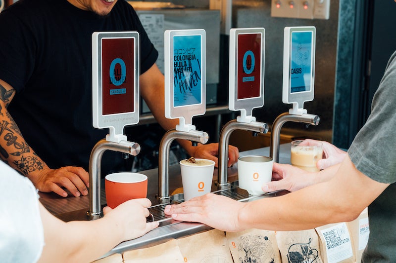新しい渋谷のカフェでは、4つのタップからセルフサーブでコーヒーを楽しむことができます。時期によって入れ替わるシングルオリジンをはじめ、期間限定ブレンドを含むブレンドも提供します。