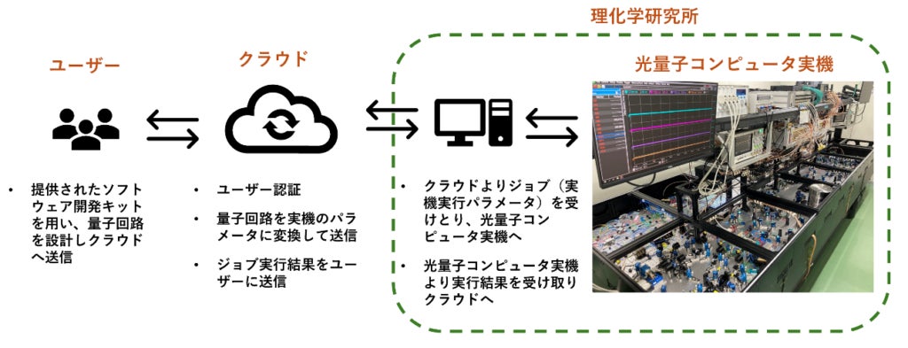 ユーザーは量子回路をデザインしクラウドへ送信する。クラウド上で量子回路は実機パラメータへ変換され、光量子コンピュータ実機へと送られ、量子操作を実行する。ユーザーは実行結果をクラウド経由で受け取る。