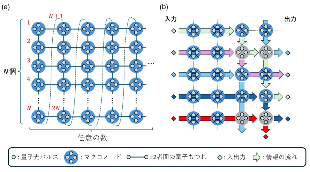 (a)マクロノードを並び替えると、量子もつれが時間的に格子状に広がっている(多重化されている)ことが分かる。これが量子コンピュータの計算のリソースになる。量子もつれのサイズ、すなわち計算のリソースは、時間をかければかけるほど大きくなる。