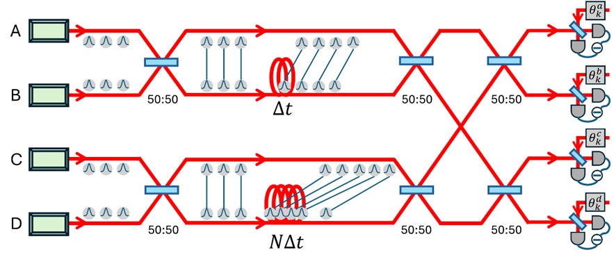 A、B、C、Dは光パラメトリック増幅器を表す。このデバイスから、量子揺らぎが圧搾された光(スクイーズド光)が出射される。これを時間Δtで区切り、光パルスとして扱う。二つの光パルスが50%反射ビームスプリッター(青の長方形)で重ね合わされると、A-B間、C-D間にそれぞれ2者間量子もつれが次々と生成される。その後、Bの光路では光パルス一つ分(Δt)、Dの光路では光パルスN個分(NΔt)をそれぞれ遅延させる。その結果、2者間量子もつれが異なる時間に分配される。これを複数の50%反射ビームスプリッターで重ね合わせてから測定することで、テレポーテーションベースの量子操作が実行される。量子操作に応じて、光パルスごと(kはパルスの番号)に測定基底を変更する。