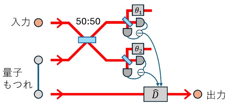 量子テレポーテーションは、入力の量子が持つ情報を、量子もつれを介して出力へと伝送する手法である。入力と量子もつれは50:50(50%反射、50%透過)のビームスプリッター(青の長方形)で重ね合わされ、その後測定される。測定値は電気信号として出力側に伝送され、量子操作が実行されることで、量子テレポーテーションが完了する。ここで、測定基底(θ1およびθ2)の変更を行うことで、入力に対して多様な量子操作を実現できる。測定誘起型量子コンピュータでは、量子もつれを大規模に生成して、その測定を介して量子テレポーテーションを繰り返し実行する。