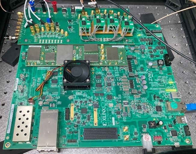 図4右は光測定器のコントロールと測定値のデータ収集を行うプログラマブルロジックデバイス[11]です。このデバイスは100MHzの周期で電気パルスを生成し光の測定基底を高速で操作します。これにより所定の量子操作を各マクロノードに行うことになります。