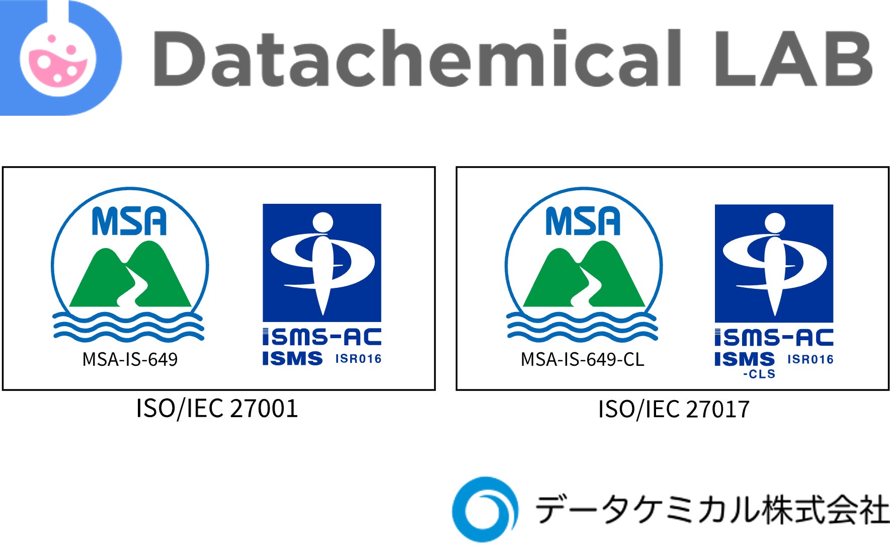 化学の実験データ活用AIクラウドサービス「Datachemical LAB(データケミカルラボ)」を提供するデータケミカル株式会社(代表取締役:吉丸昌吾、本社:東京都渋谷区)は、2023年5月、情報セキュリティマネジメントシステム(ISMS)の国際規格である「ISO/ IEC 27001」、およびISMSクラウドセキュリティ認証「ISO/ IEC 27017」を取得したことをお知らせいたします。