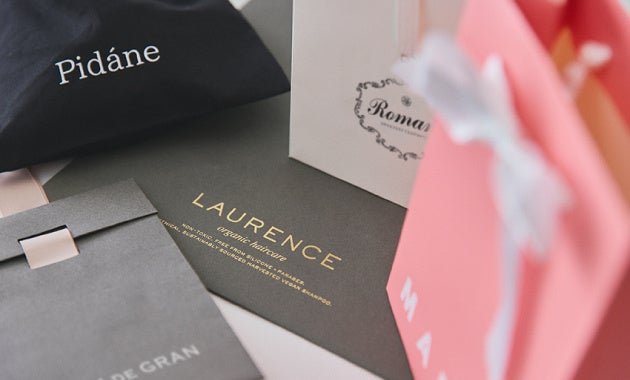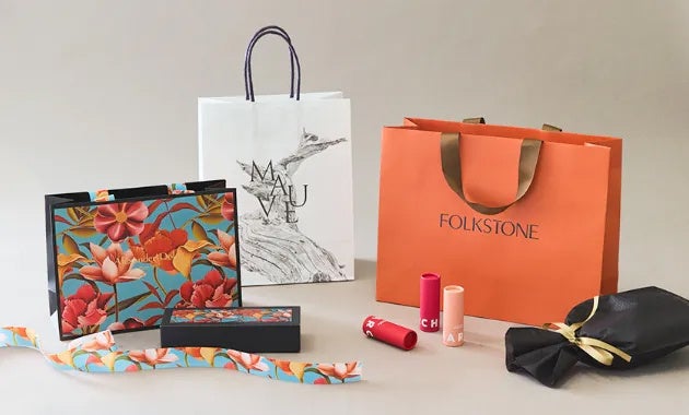 紙袋だけでなく、不織布バッグ、ポリ袋、ボックス、リボン、シールなど多様なアイテムを展開。ブランドの世界観をトータルで表現できます。
