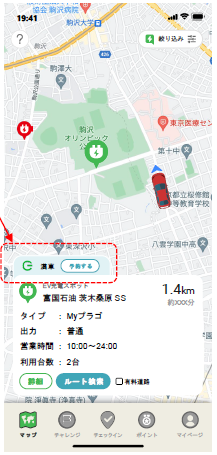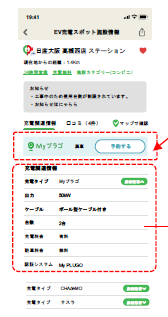 「絞り込み」メニュー内の充電タイプを「Myプラゴ」で絞り込んで検索、またはMAP上のアイコンをタップするとリアルタイムの満空情報が表示されます。空車であれば、【利用ボタン】からそのまま充電利用ができ、【予約ボタン】からはスマートフォンアプリ「Myプラゴ」へ遷移し、予約も可能。