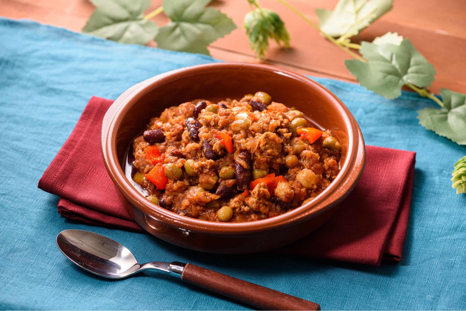 スパイスの香る特製トマトチリソースで煮込んだ4種の豆は、それぞれの食感を楽しめます。