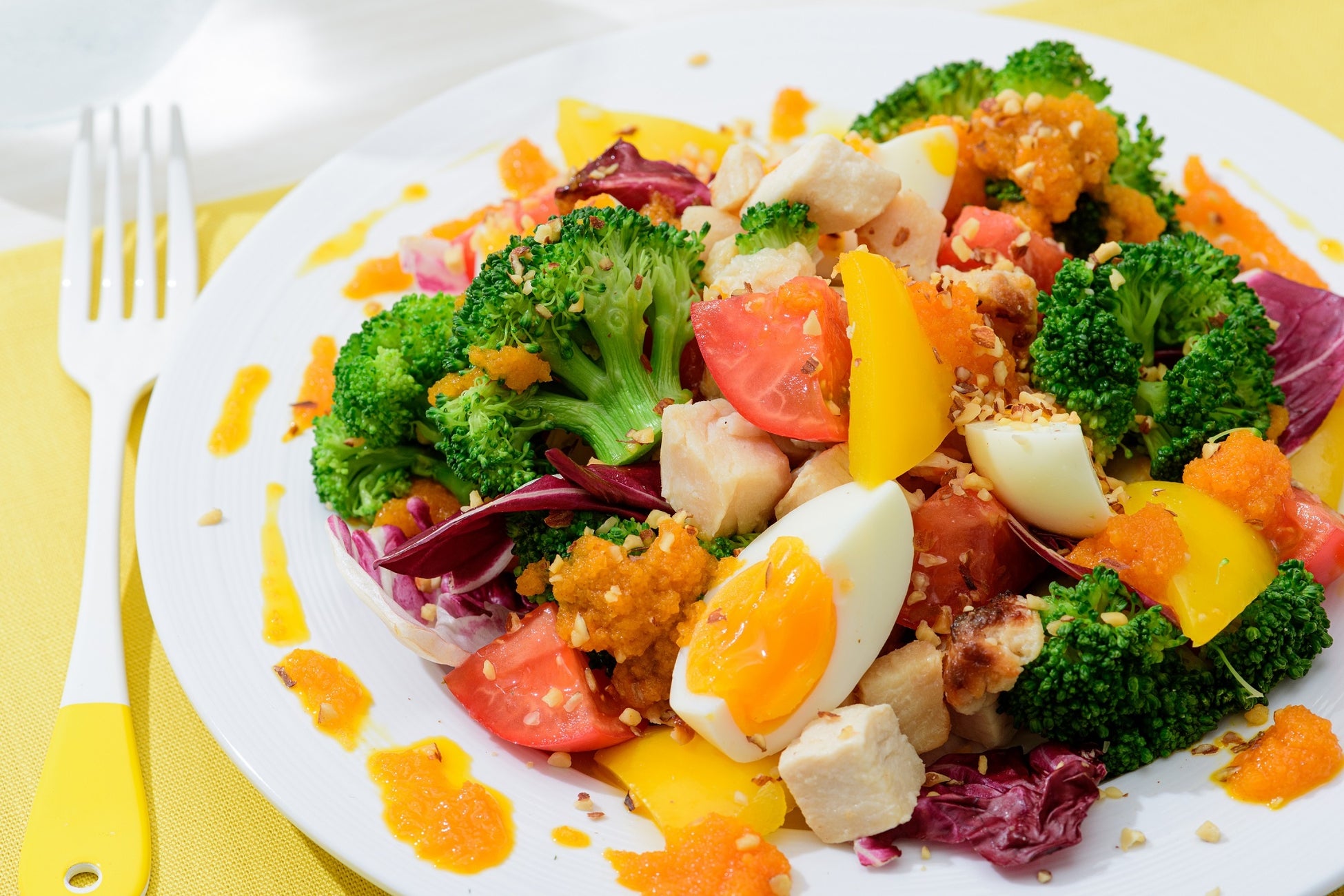 抗酸化ビタミンとよばれるビタミンA・ビタミンC・ビタミンEがカラダに嬉しいサラダ。濃厚な甘みと酸味が特徴のアメーラトマトに、ごろっとサイズにカットした野菜とチキン、ゆで卵を合わせた満足感たっぷりのサラダです。※厚生労働省推進・健康日本21の野菜摂取目標値(1日350g)に対して