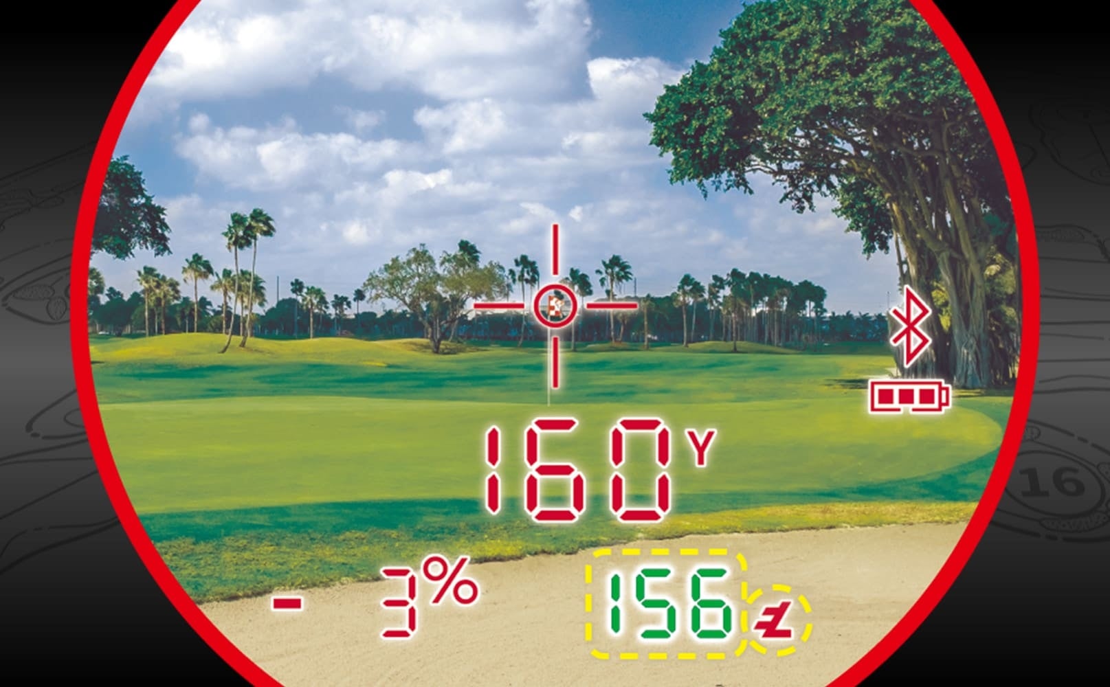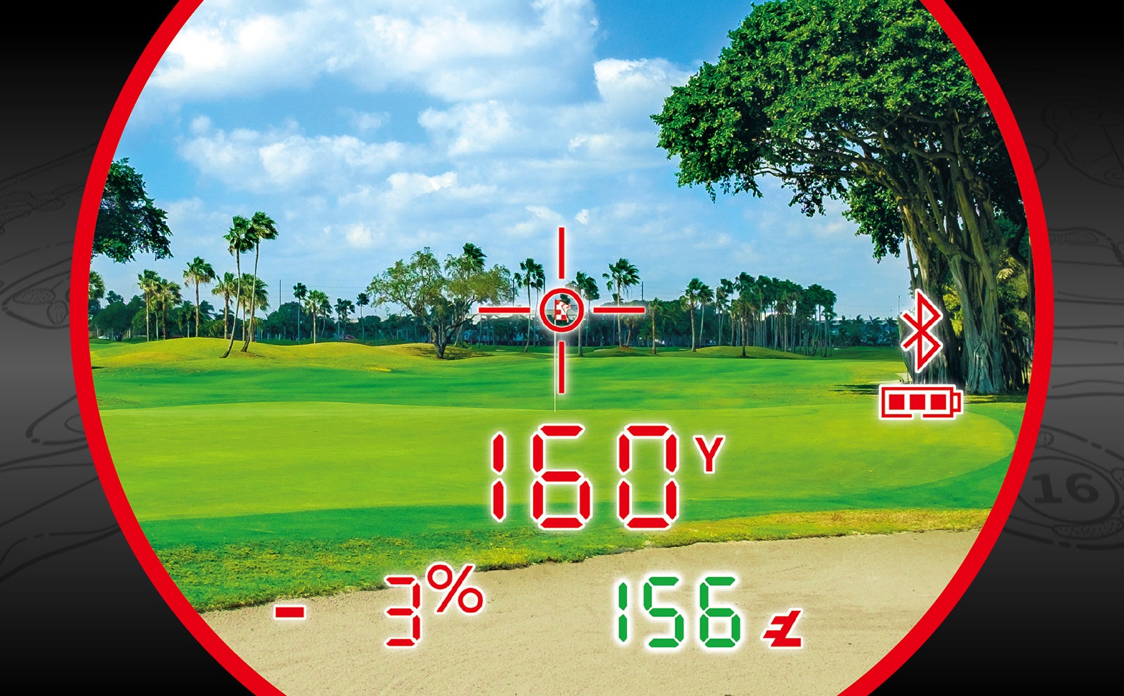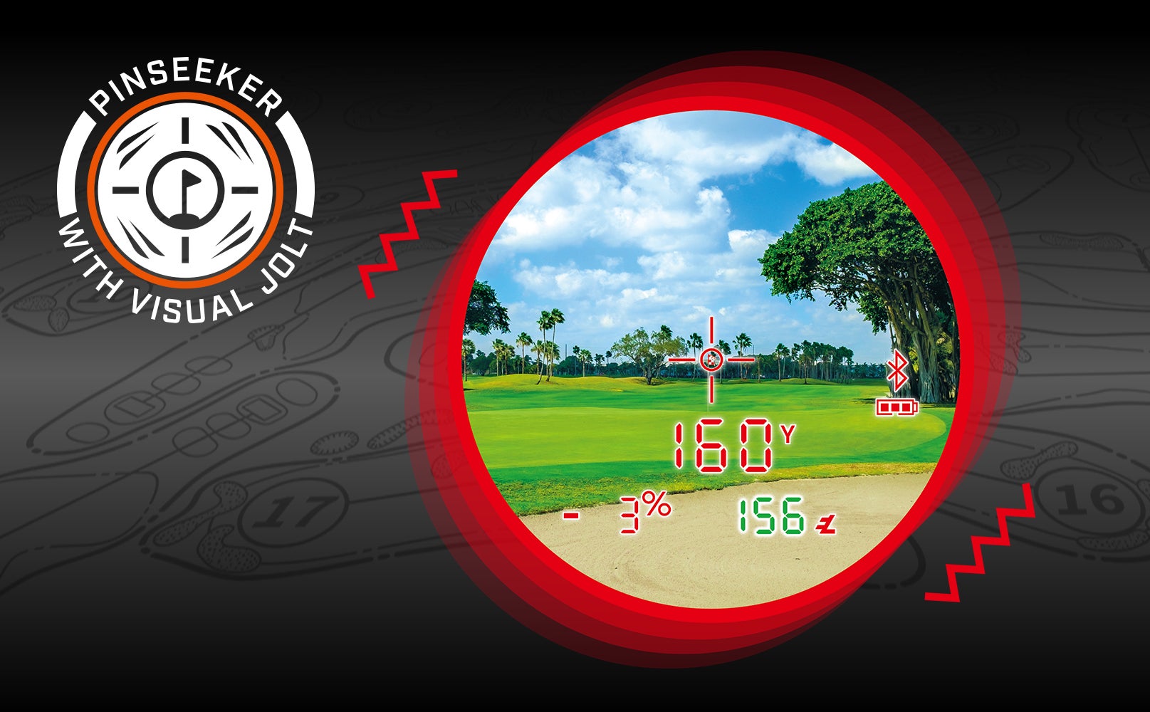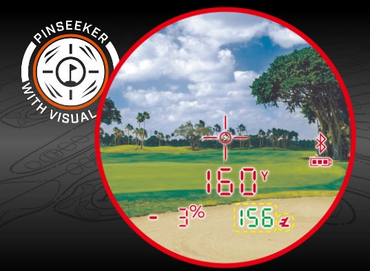ピンフラッグなど細い目標物測定時にピンシーカー機能が作動した際、本体がビビッと振動。 同時に視界上にレッドリングが発光。測定完了を瞬時に視覚、体感で把握できる便利な機能。