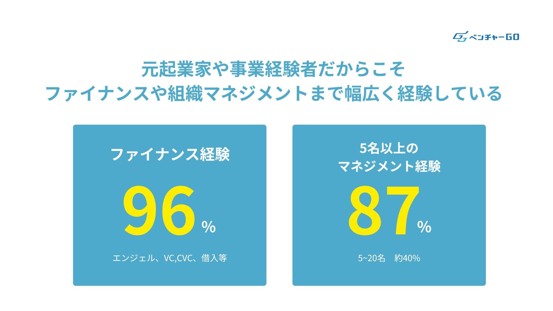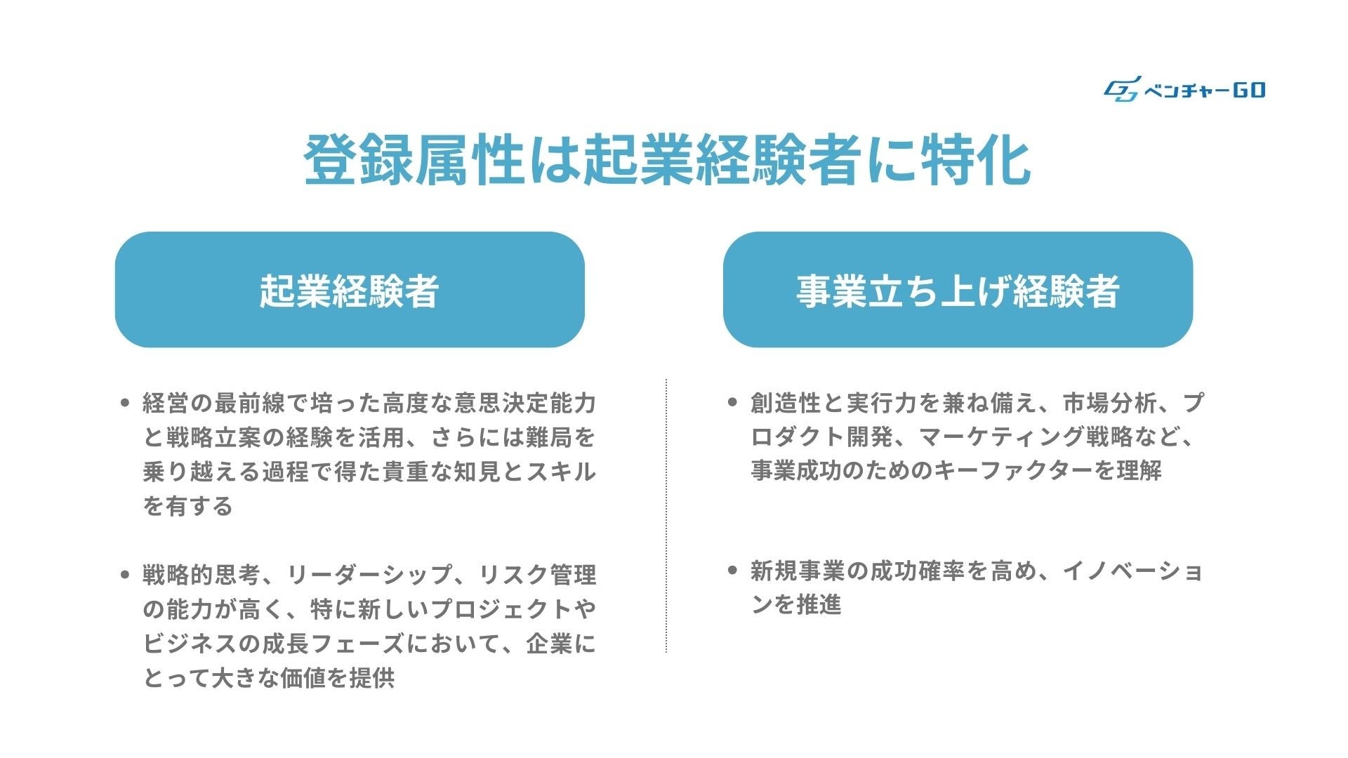 失敗成功問わず、起業経験は「宝」です。ベンチャーGOでは、その起業経験を評価する企業と出会え、起業家のセカンドキャリア支援を中心にサービス提供しています。国内市場で初の「起業経験者専門の人材サービス」提供となり、高い事業推進力や組織マネジメント能力、ファイナンス能力を評価して積極的に採用チャネルとして導入する企業様も急増しております。