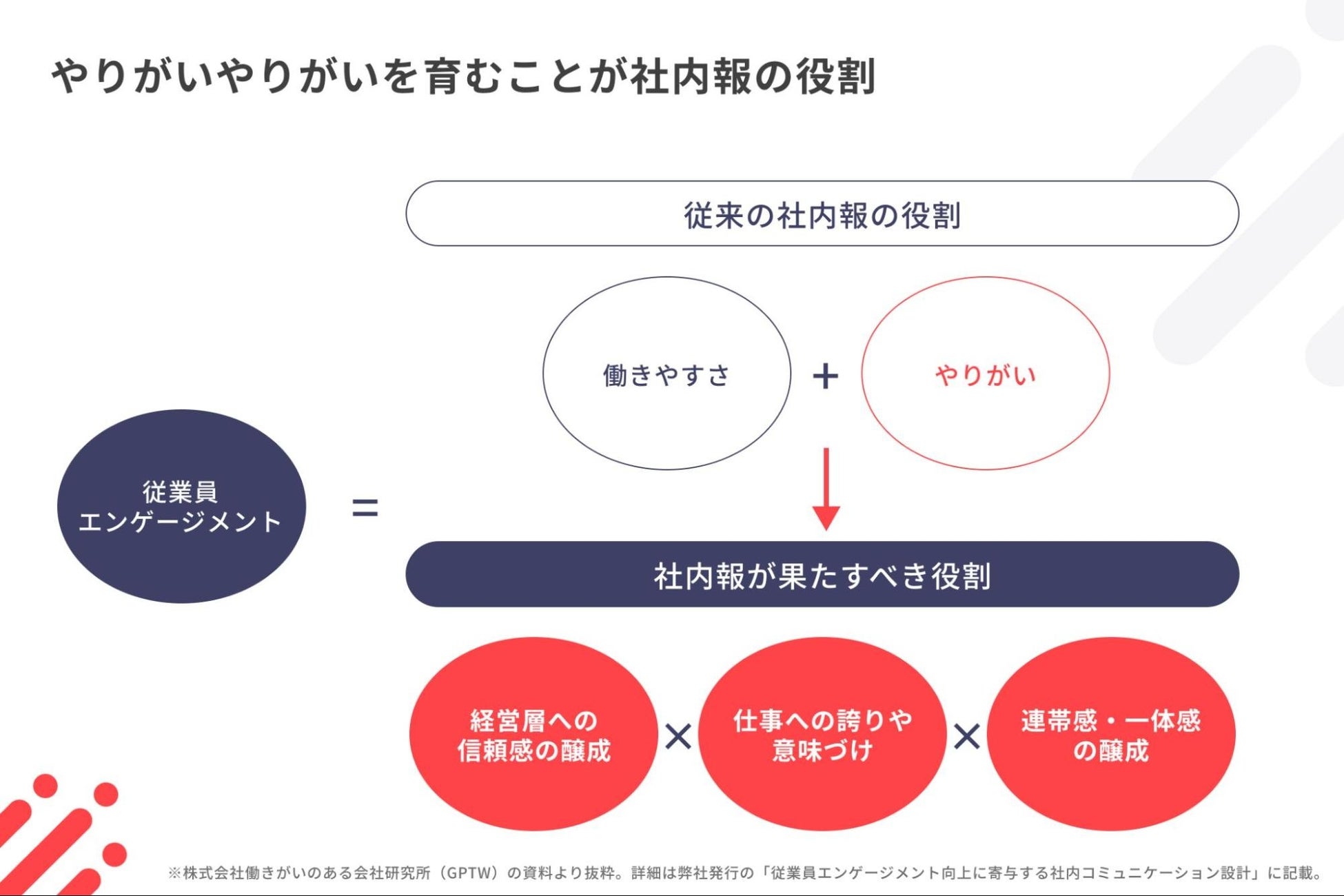 従業員エンゲージメントの構成要素は「働きやすさ(労働環境や条件面)」と「やりがい」に分けられます(※)が、日本の多くの企業はやりがい向上に課題があるといわれています。やりがい向上には「経営層への信頼」「仕事への誇りや意味付け」「連帯感・一体感醸成」が重要と言われており、これらを育むことが社内報の役割です。