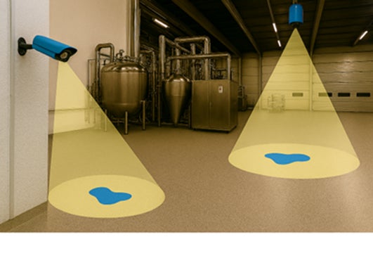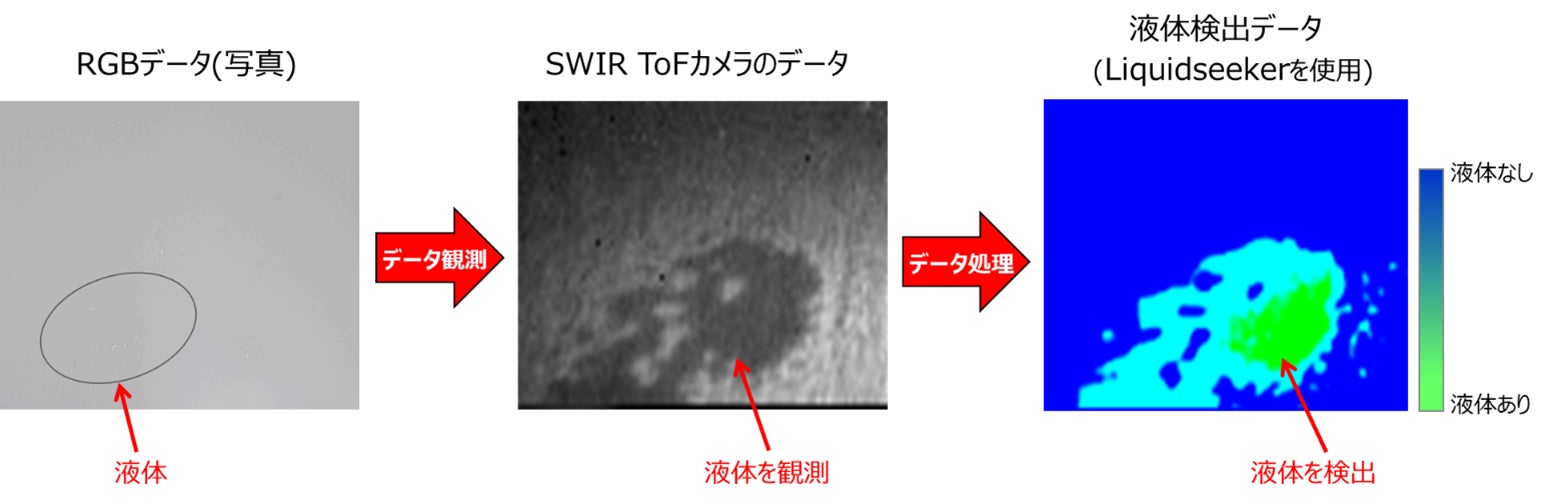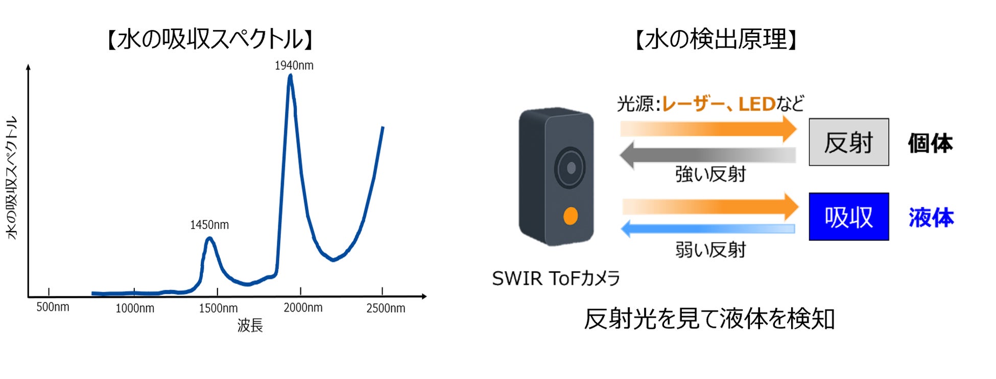 Liquidseekerは、特定の波長光で水が光を吸収する原理を利用し検知を行っています。LiquidseekerとSWIR ToFカメラ「漏水・薬液検知 SWIR 3Dカメラ」を組み合わせることで、液体を非接触で検知することができます。