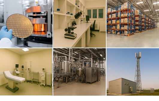 本システムは、半導体製造装置、検査装置、倉庫、工場設備、プラント施設、研究施設、通信基地局、医療施設、データセンターといった幅広い分野、各種装置や施設等への適用が可能です。