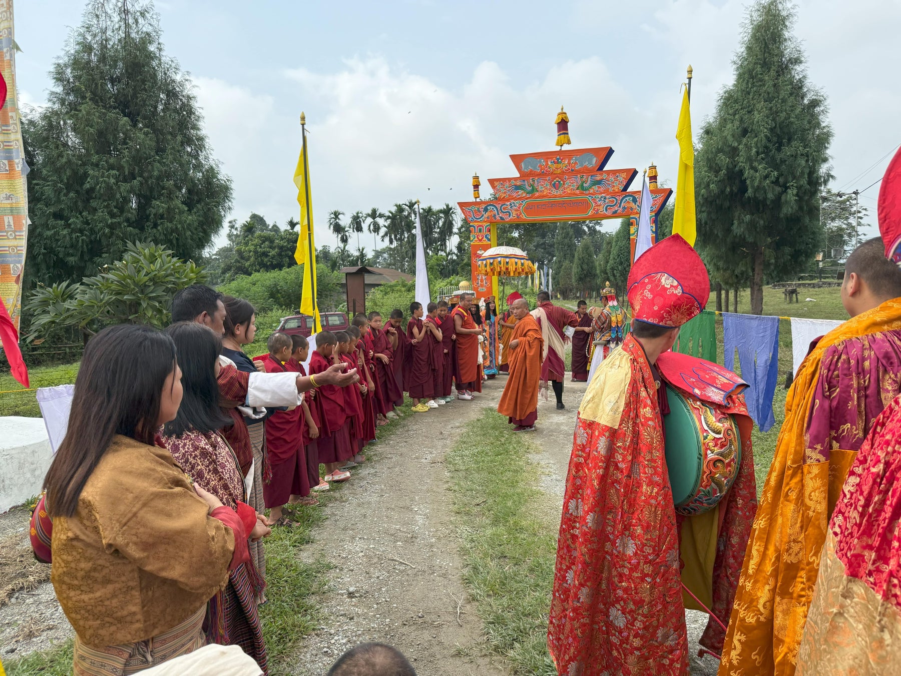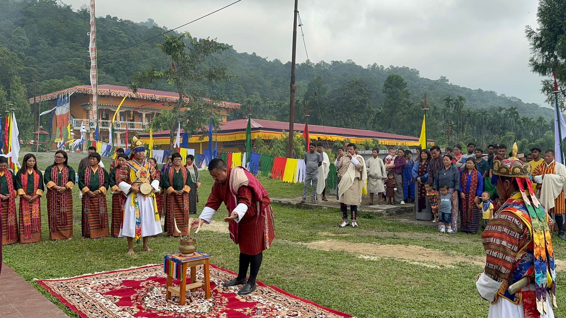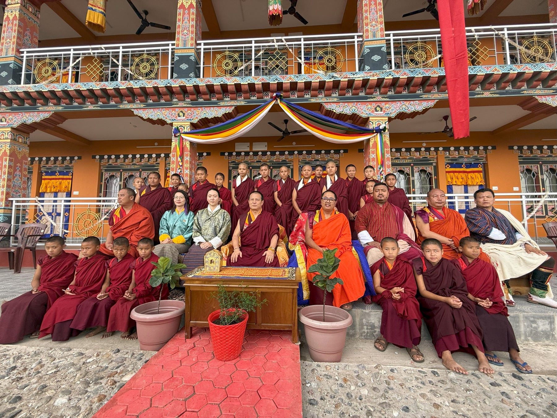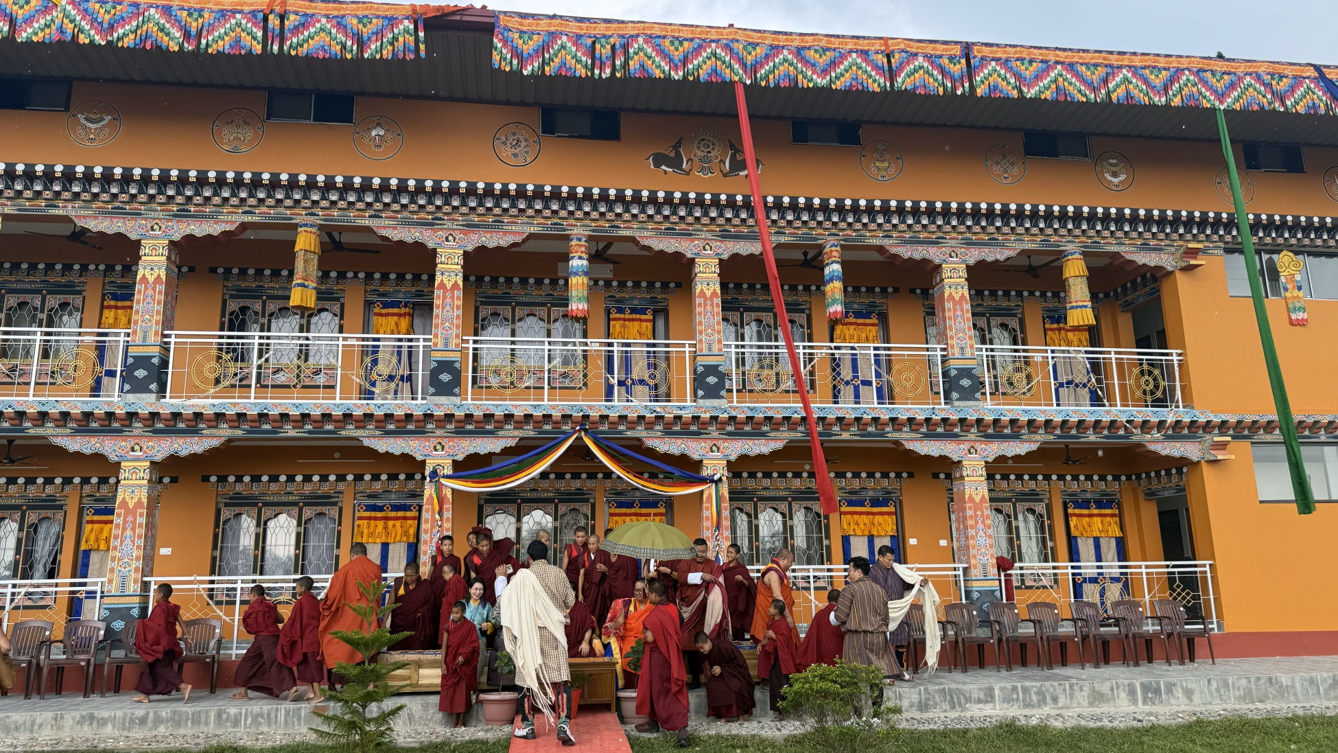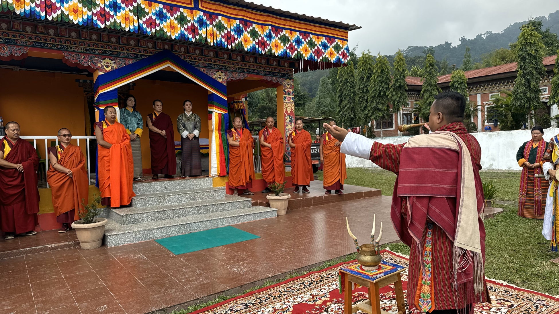 式には、施設の入所児童、ブータン(チベット)仏教最高指導者をはじめとする僧侶の方々、たくさんの地域住民、歌唱隊、楽隊、建設に携わったスタッフなど総勢300人以上が正装で参列し、一日を通して盛大に執り行われました。敷地内の至る所がブータンの国教であるチベット仏教の教えに因んだとりどりの極彩色の布で飾り付けられ、この竣工式が特別な行事であることが窺えました。式典は主にチベット仏教の儀式に則って厳かに進められ、儀式に合わせて伝統的な楽器で音楽が奏でられました。儀式の後にはブータンの伝統的な歌や踊りが披露され、手作りの野菜や米を使った手料理が振舞われました。