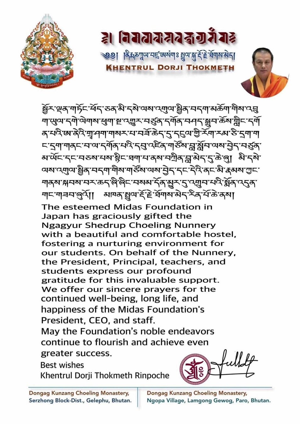 ―ブータンにおけるチベット仏教最高指導者のひとりであるKhentrul Thokmeth Rinpoche(リンポチェ)よりメッセージ―