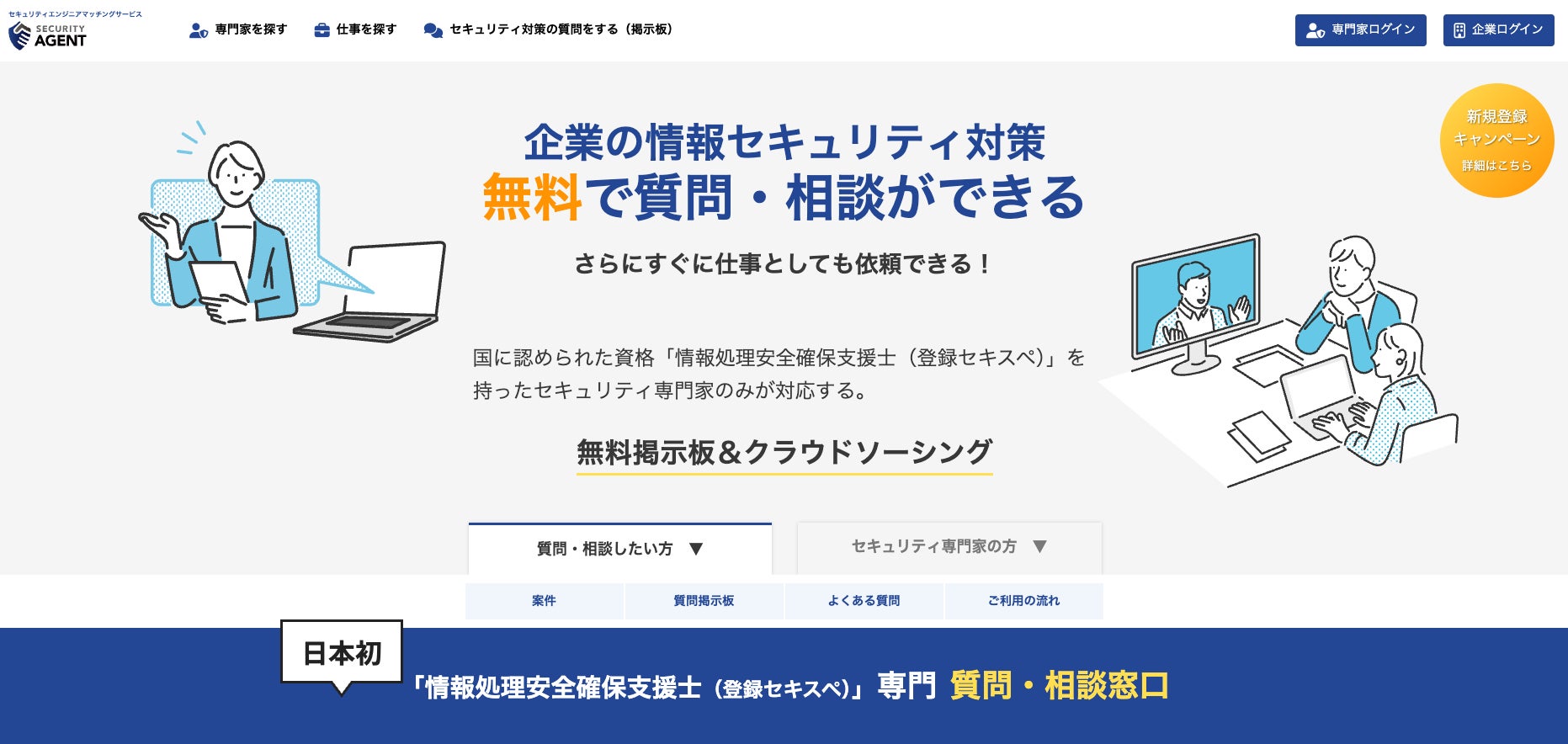 『セキュリティエージェント』は、情報処理安全確保支援士(登録セキスペ)の資格を持つセキュリティコンサルタントなどの専門家が登録し、企業のニーズに応じた最適なマッチングを実現するサービスです。