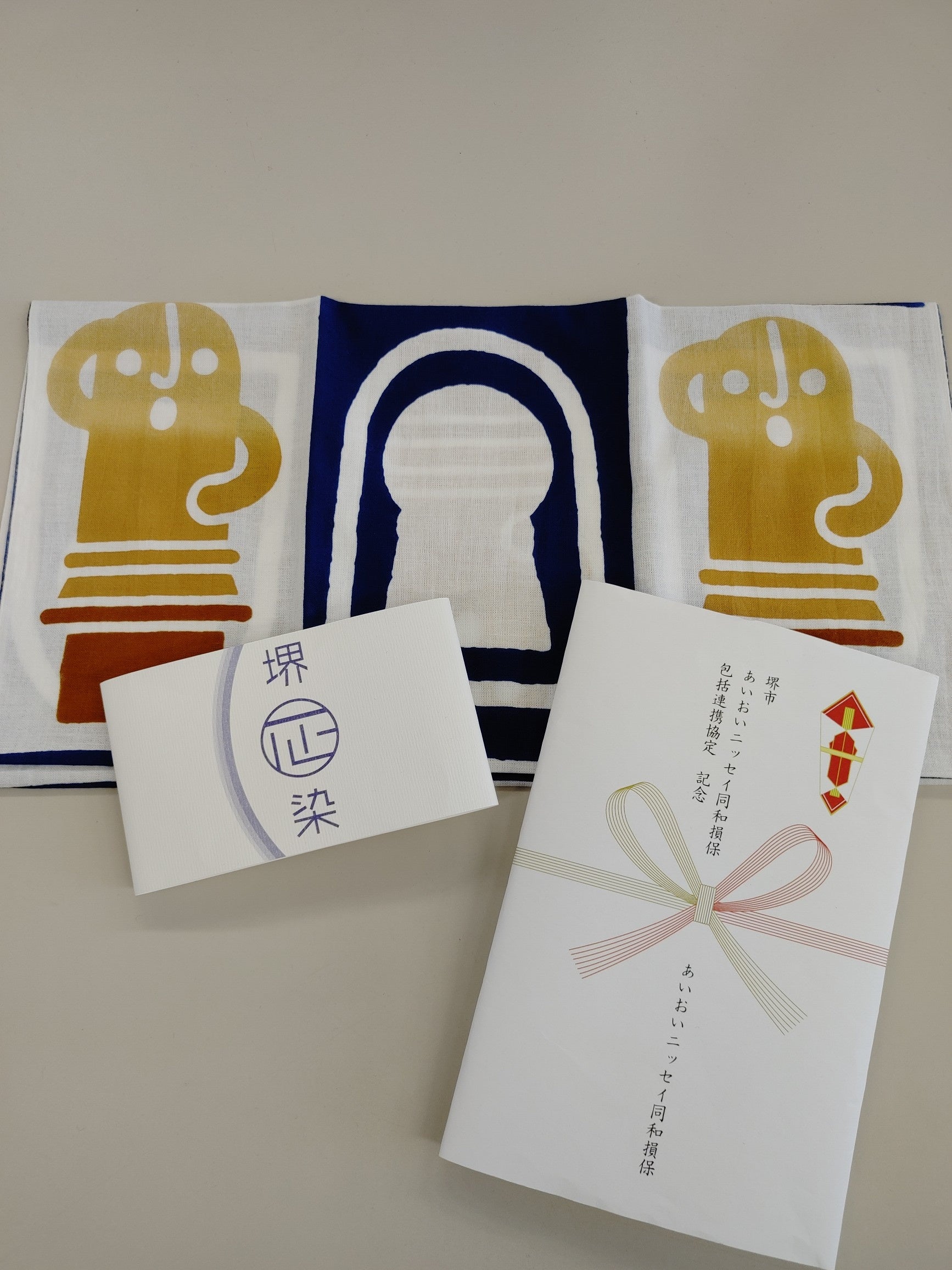 今回の取組では、伝統産業のブランド力向上に向けて、地域密着を掲げる同社において、堺注染和晒興業会が製作する「はにわ」をデザインした手ぬぐいをノベルティとして採用いただき、同社のネットワークを活用し、浪華本染め(注染)の魅力や品質の良さを発信します(令和4年6月1日(水)から順次実施)。