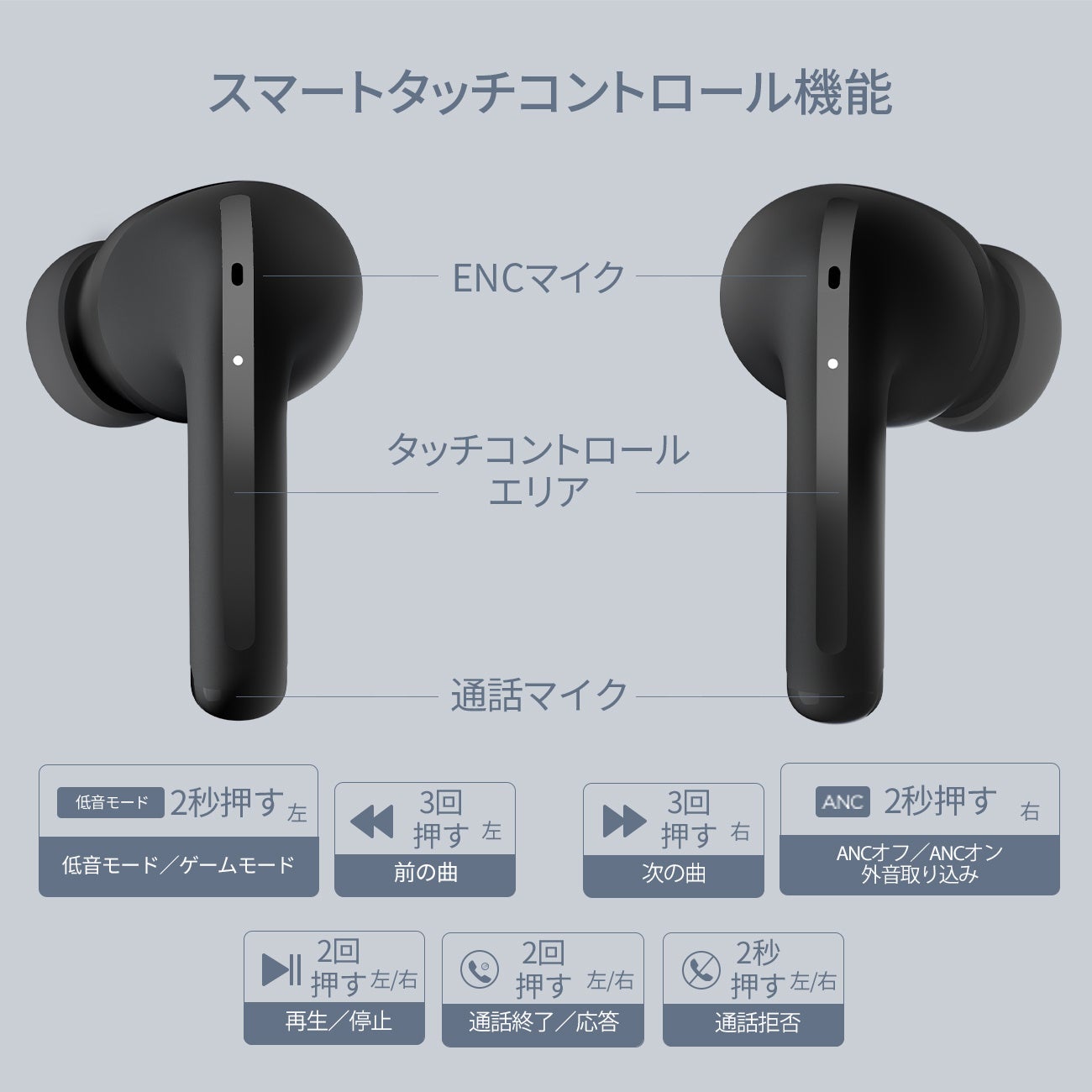 アプリを必要としない本製品は、ほとんどの動作をイヤホン本体のタッチコントロールで操作します。