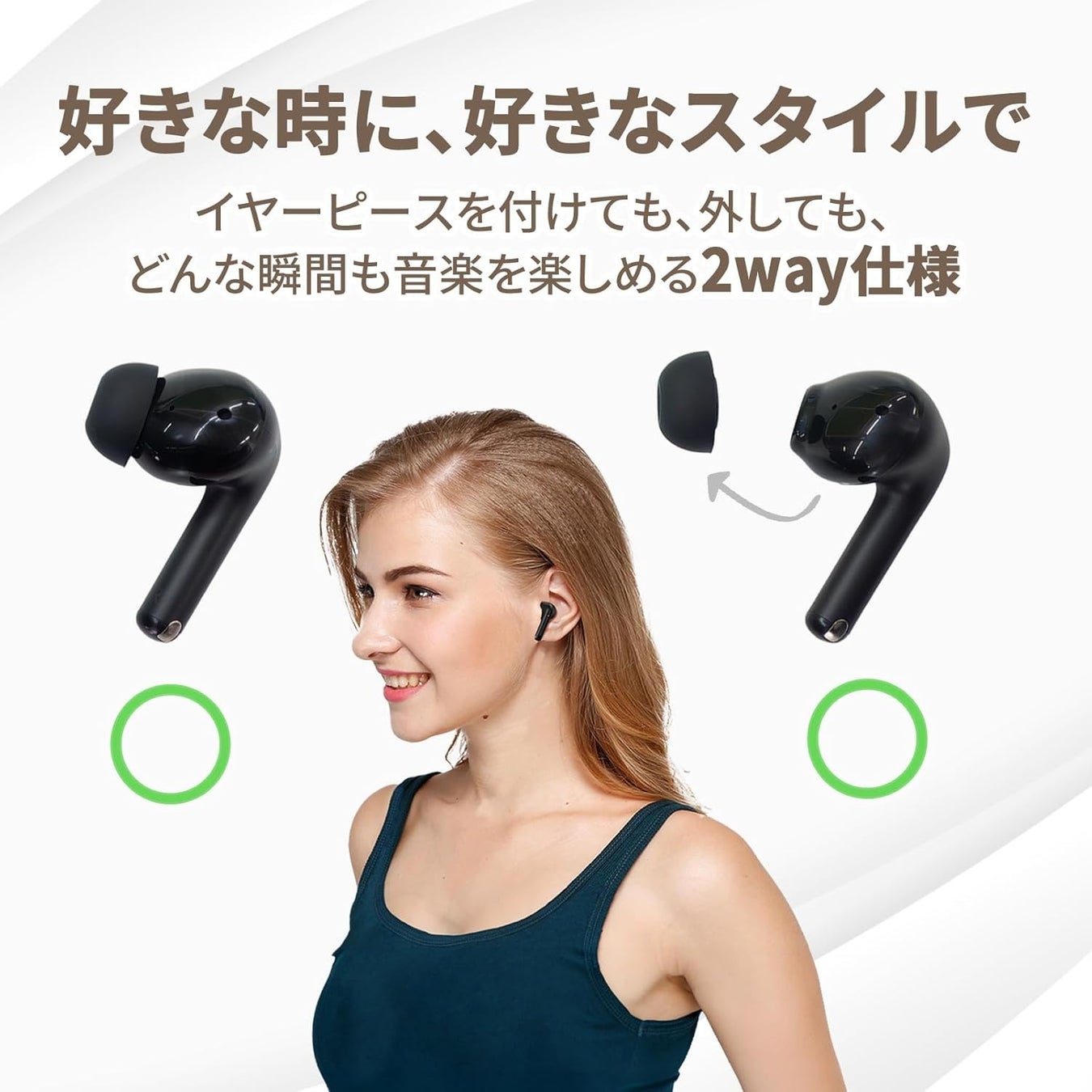 付属のイヤーピースを取り外すことで、カナル型とインナーイヤー型を自由に変更可能です。装着感や快適さ、その日の気分に応じて自分好みの音楽体験を選択することが可能です。
