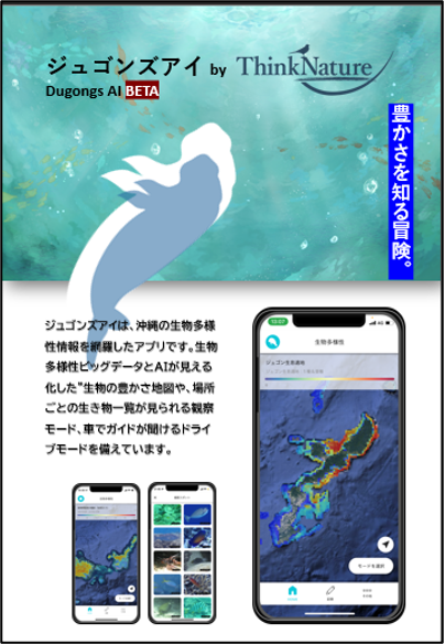 沖縄は、生き物の豊かな地域です。しかし、自然界にひっそりと暮らしている野生生物の姿を、一般の人々が認識するのは難しいです。そういう、人知れない状況で、多くの生き物たちが人間活動によって消失し、自然資本の劣化に伴う経済的な不利益を、私たちは被りつつあるのです。沖縄の自然の豊かを未来に受け継いでいくアクションを起こすためには、多くの人たちが生物多様性の価値を理解する必要があります。だからこそ、私たちの身の周りに暮らす生き物たちを「見える化」することが大事になります。そのような願いを込めて、私たちは、生物多様性可視化アプリを開発しました。沖縄の生き物の豊かさを象徴するジュゴンの名前を借りて、ジュゴンズアイと命名しました。アイには、AI(人工知能)、EYE(眼差し)、愛(Love)をかけています。生物多様性ビッグデータと人工知能を基にしたジュゴンズアイを通して、沖縄の豊かな自然を認識してもらい、生物多様性市場の創出へ向かうことを、私たちは期待しています。