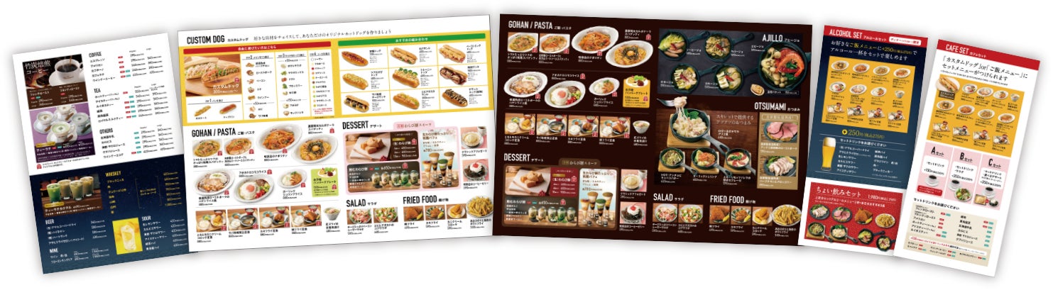 〈左〉カスタムドッグ〈右上〉喫茶店のナポリタン〈右下〉濃厚明太カルボナーラ