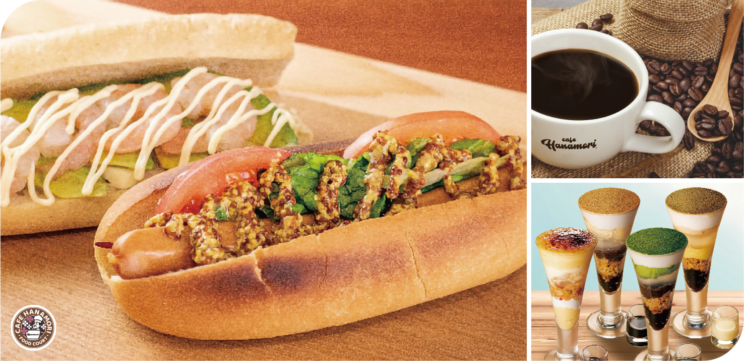 「cafe Hanamori」では、豊富なカフェメニューやスイーツに加え、アルコール、バルメニューもご⽤意。フードコートのように“カフェ”の枠にとらわれない様々なサービスを1店舗で実現しています。
