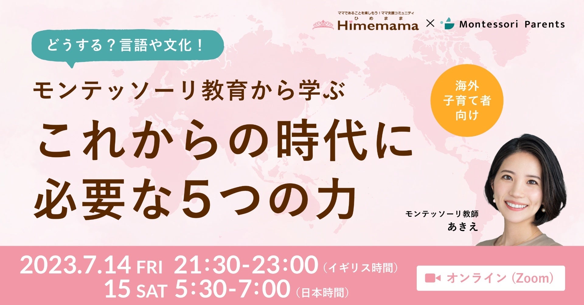 ママ応援コミュニティ Himemama(ひめまま)とコラボした海外在住者向け子育てセミナー『モンテッソーリ教育から学ぶ これからの時代に必要な5つの力』をオンラインで開催します。