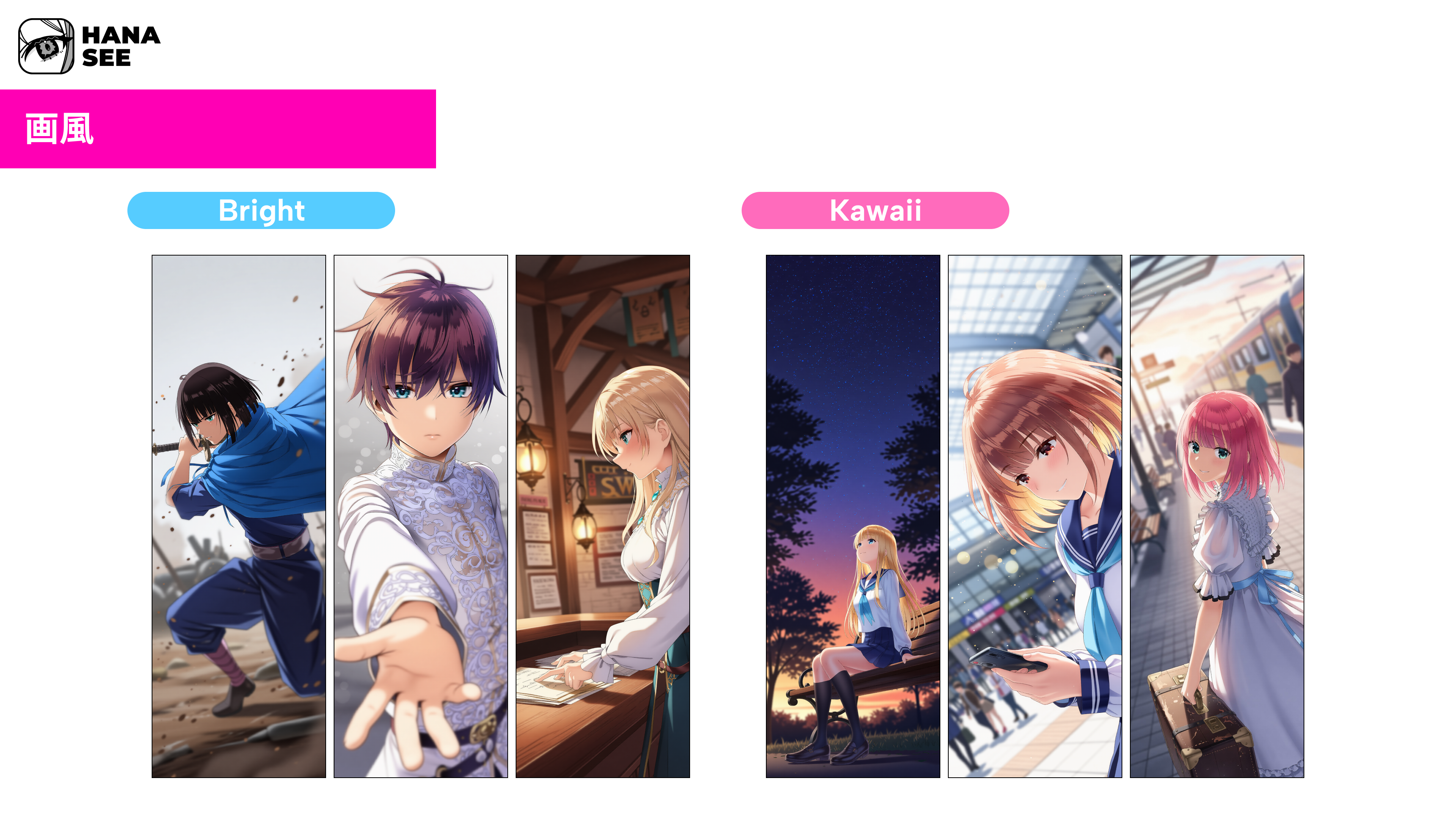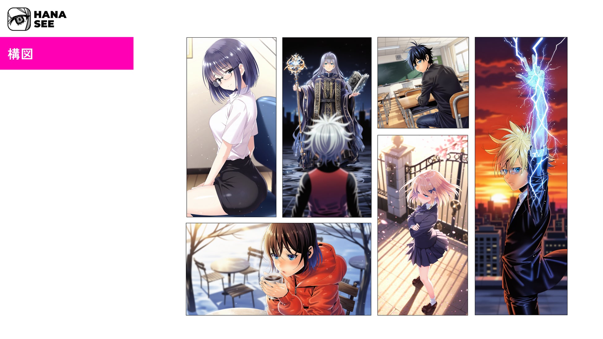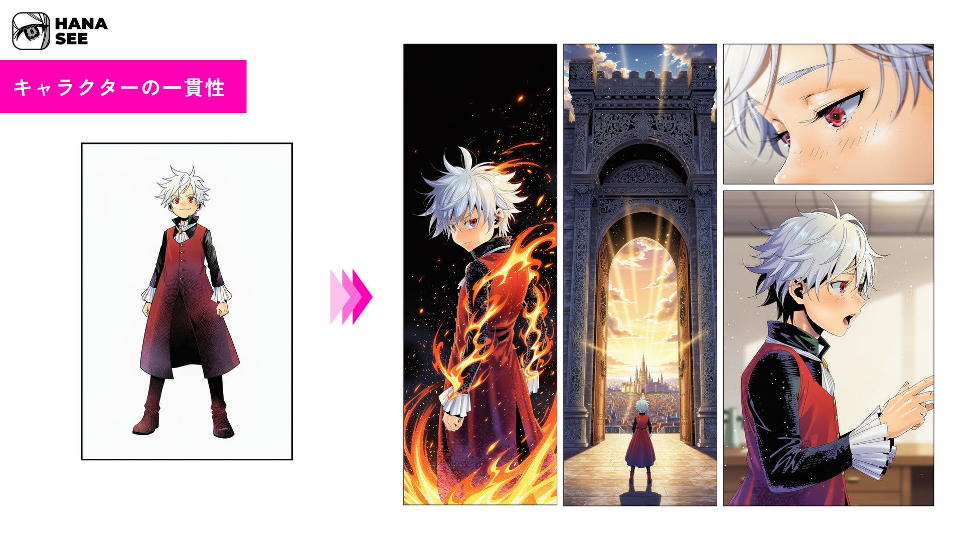 HANASEE」は、アイデアやストーリーを縦読みマンガとして創作できるマンガ創作プラットフォームです。小説や、ストーリーの原型となるアイデアをもとに、キャラクター・世界観・画風が一貫した連載マンガを、独自の画像生成モデルおよび創作ワークフローによって生み出すことが可能です。