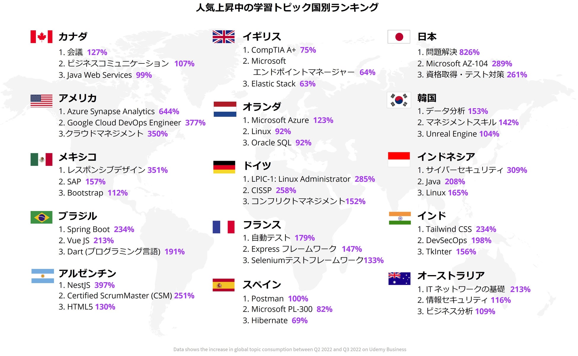 オンライン学習・教育のリーディングカンパニーであるUdemy(ナスダック:UDMY)は本日、「2022年第3四半期 ワークプレイス・ラーニングインデックス」を発表し、テクノロジースキルとパワースキルで日本および世界中のオンライン学習者が最も学んでいるスキルを明らかにしました。